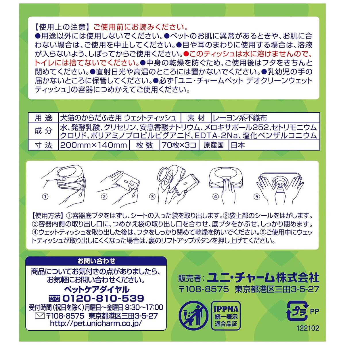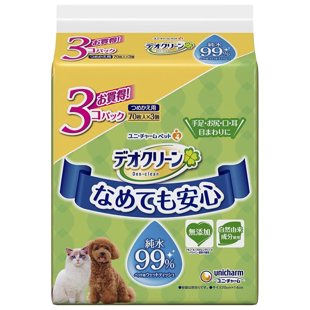 商品紹介 ・ペットがなめても安心 ・純水99%水分たっぷりのペット用ウェットティッシュ ・無添加(ノンアルコール、無香料、パラベン無配合) 使用方法 商品使用時サイズ:厚手普通サイズ:20cm×14cm