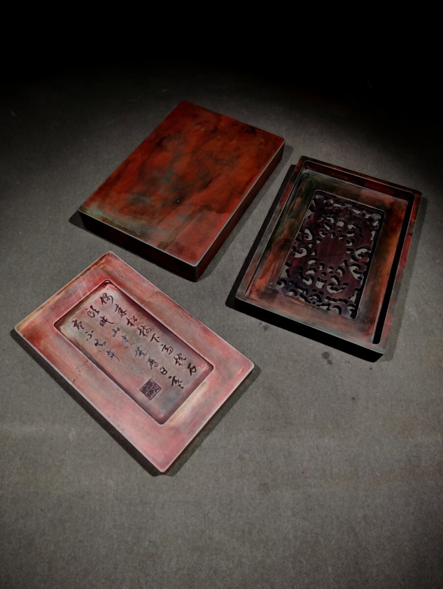 【瓏】松花石彫 双花瓶池文房套硯 康熙宸翰銘 清時代 手彫り 文房四寶 書道具 中国古硯 古美術 蔵出