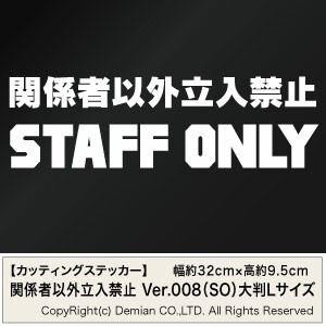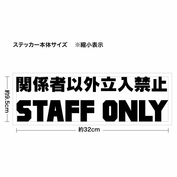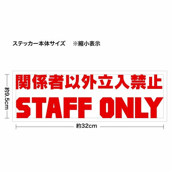 【関係者以外立入禁止 STAFF ONLY Ver.008 カッティングステッカー 2枚組 大判Lサイズ 幅約32cm×高約9.5cm】 シートの材質は屋外看板用に使用されている耐光性・耐水性に優れた業務看板用シート(屋外耐候5-7年)ですので屋外でもご使用頂けます。 シートを切り抜いてアプリケーションシート(台紙)を付けて、すぐに貼れる状態で発送致します。万一貼付けに失敗しても安心の2枚組となります♪大きくなる程、貼るのが難しくなりますので慎重に貼って下さい。※シート切り抜き作業等、1枚ずつハンドメイド品である事ご了承下さい。■サイズ:幅約32cm×高約9.5cm■素材:屋外看板用シート、和紙アプリケーションシート■簡単な貼り方の説明書■製作:日本※ステッカーは屋外看板用のシートです。粘着性が高いので、1週間もすると強力にくっつきます。車やバイク等大切なものに貼るときは自己責任において十分注意して貼って下さい。※シート切り抜き作業等、ハンドメイド品である事ご了承下さい。【関連キーワード】カッティングシート 切り文字 ディスプレイ 業務用ウインドー ステッカー 防水 立ち入り禁止 立入り禁止サイン スタッフオンリー 立入禁止 STAFFONLY