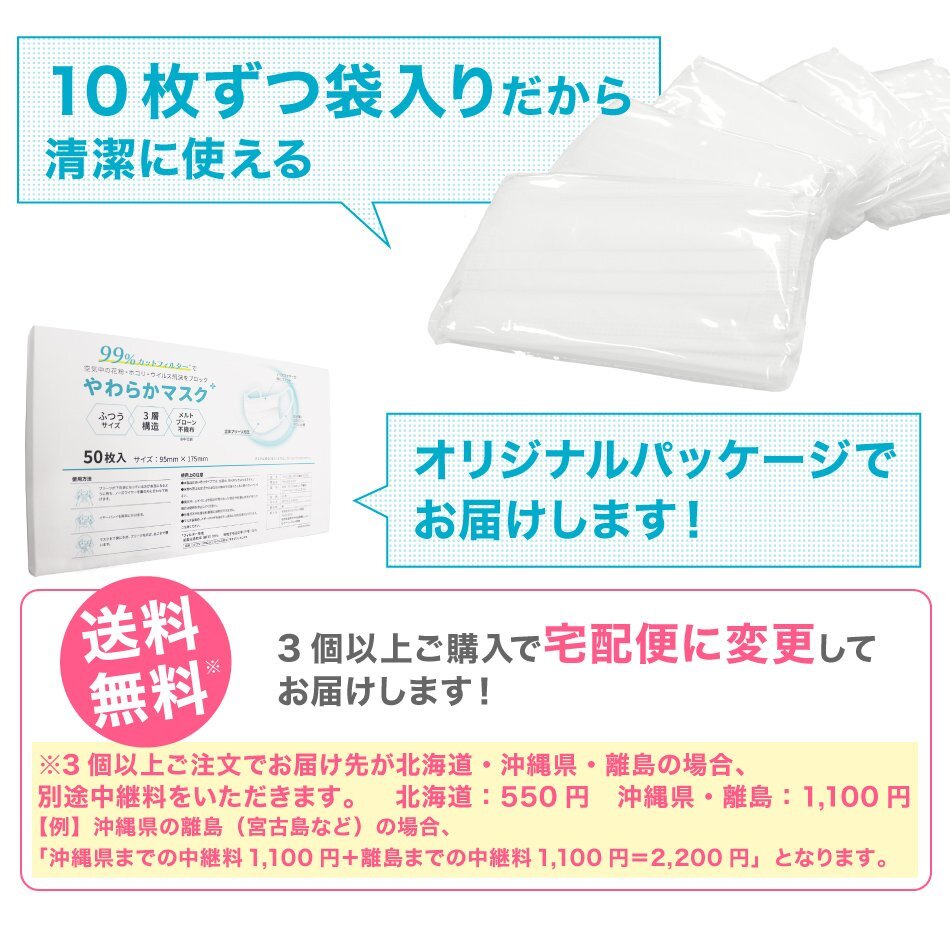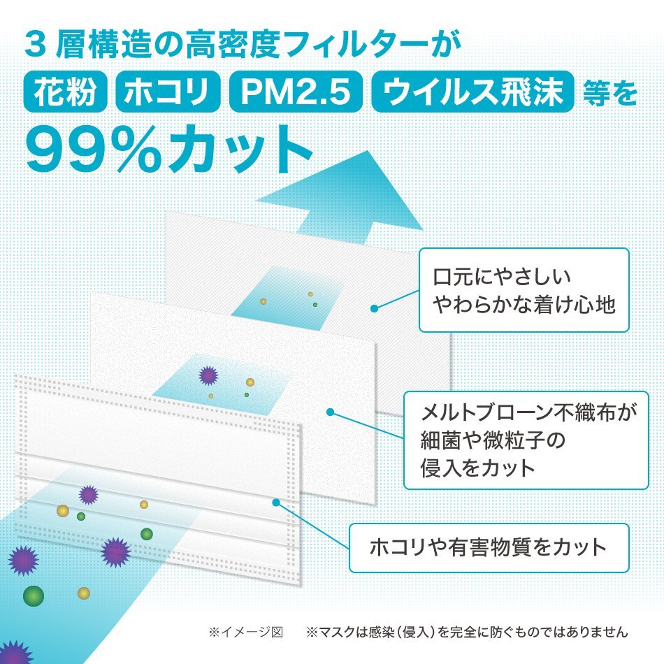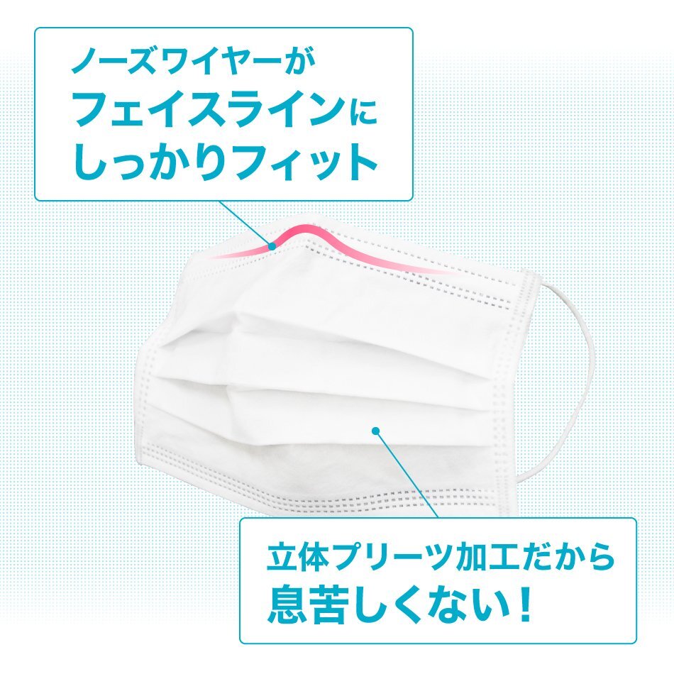 | 性能はもちろん、使用感にもこだわったマスクです。 3層の不織布構造でウィルス飛沫、ほこり、花粉等のミクロ粒子をシャットアウト。 上部に付いているノーズワイヤーが鼻周りの隙間をしっかりとカバーしてくれます。 介護、サービス業における感染症対策や花粉症対策、風邪、インフルエンザ等各種ウイルス対策に! 【商品詳細】 ◆内容:マスク 50枚入 ◆カラー:ホワイト ◆サイズ:(約)幅175mm×高さ95mm(ふつうサイズ 大人用 家庭用) ◆素材:ポリプロピレン不織布、耳ひも部分(ポリエステル) ◆素材:不織布、ポリエステル 3層構造 高密度フィルター ウイルス飛沫対策 花粉対策 PM2.5対策 ハウスダスト対策 ※代引き不可の商品です。 |