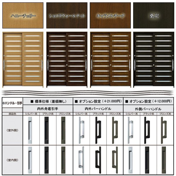 | ■ ハンドル仕様 | ■内外舟底引手 室外側:引手/室内側:引手 (基本仕様) 追加差額無し ------------------------------------------------------------------------- ■外側バーハンドル 室外側:バーハンドル/室内側:引手 (+12,000円) ■内外バーハンドル … 室外側:バーハンドル/室内側:バーハンドル (+21,000円) |
