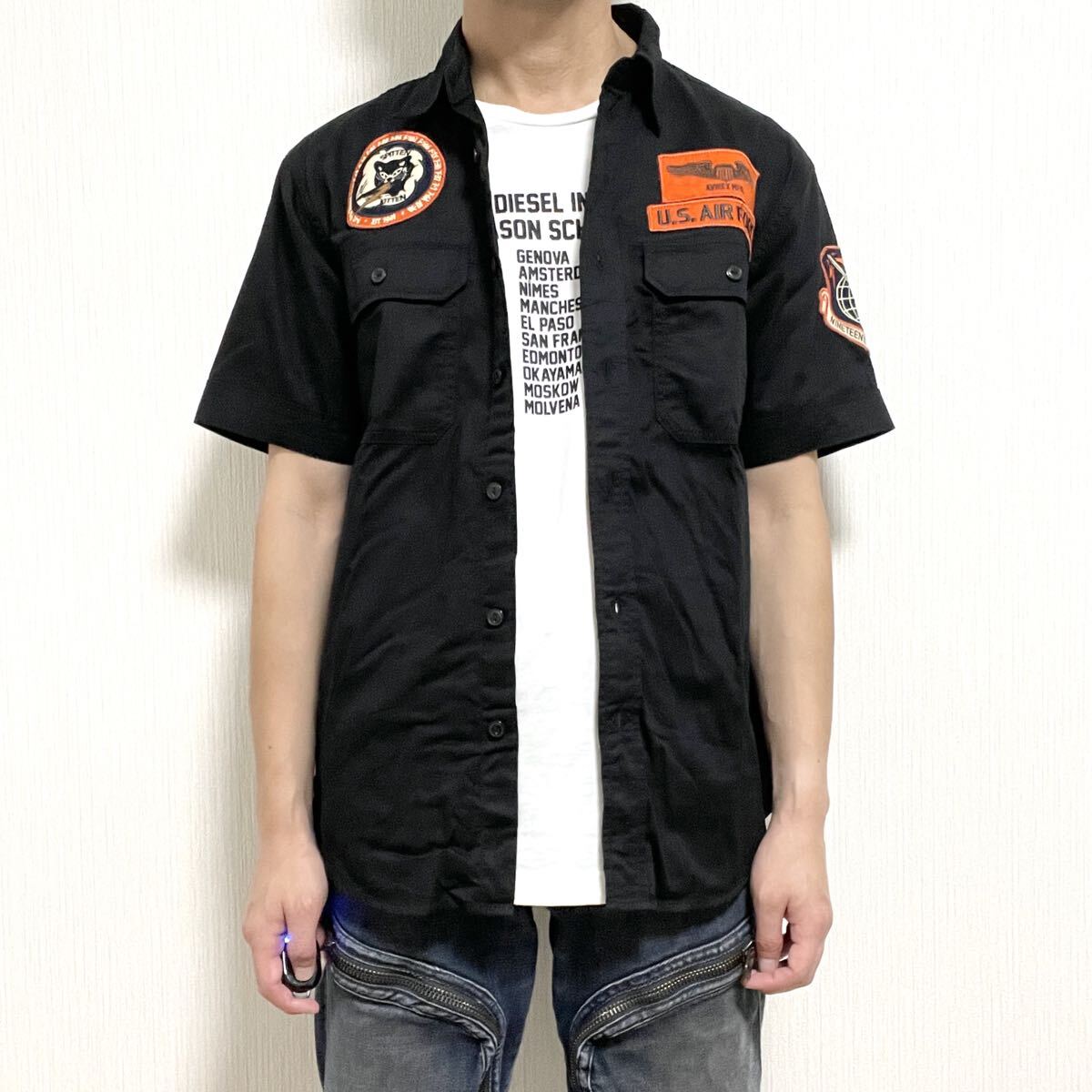 黒いボディにオレンジのワッペンが際立ち、後ろの刺繍も良い感じのミリタリーシャツです。