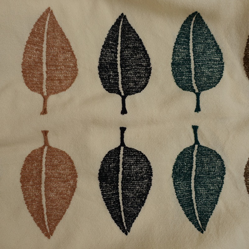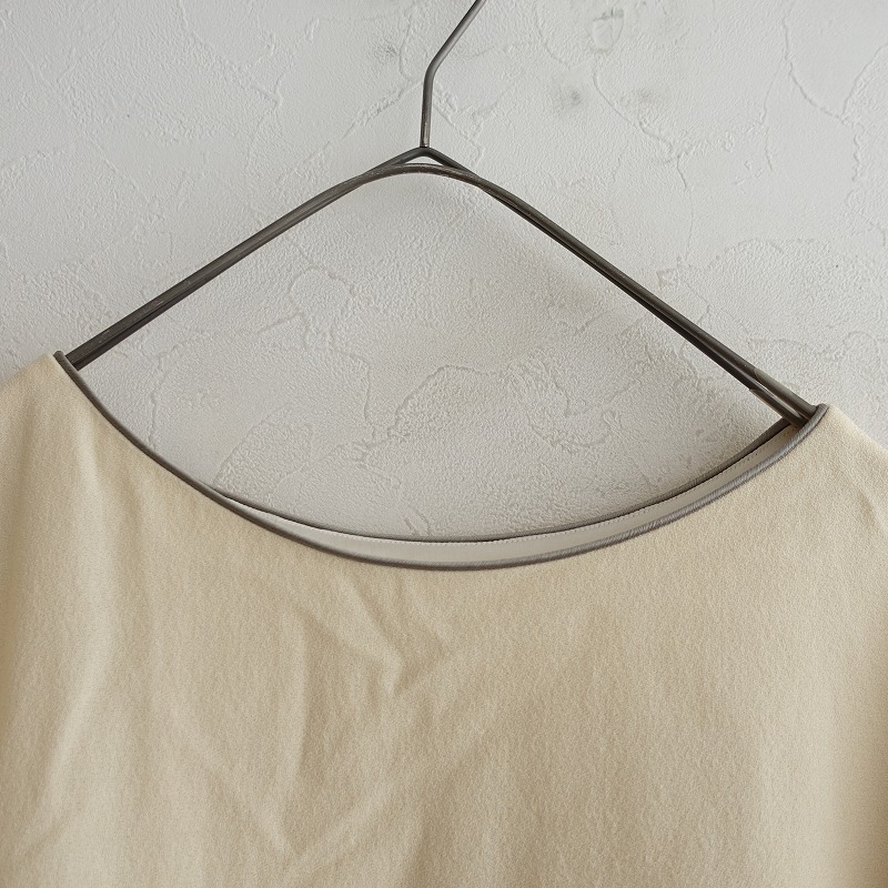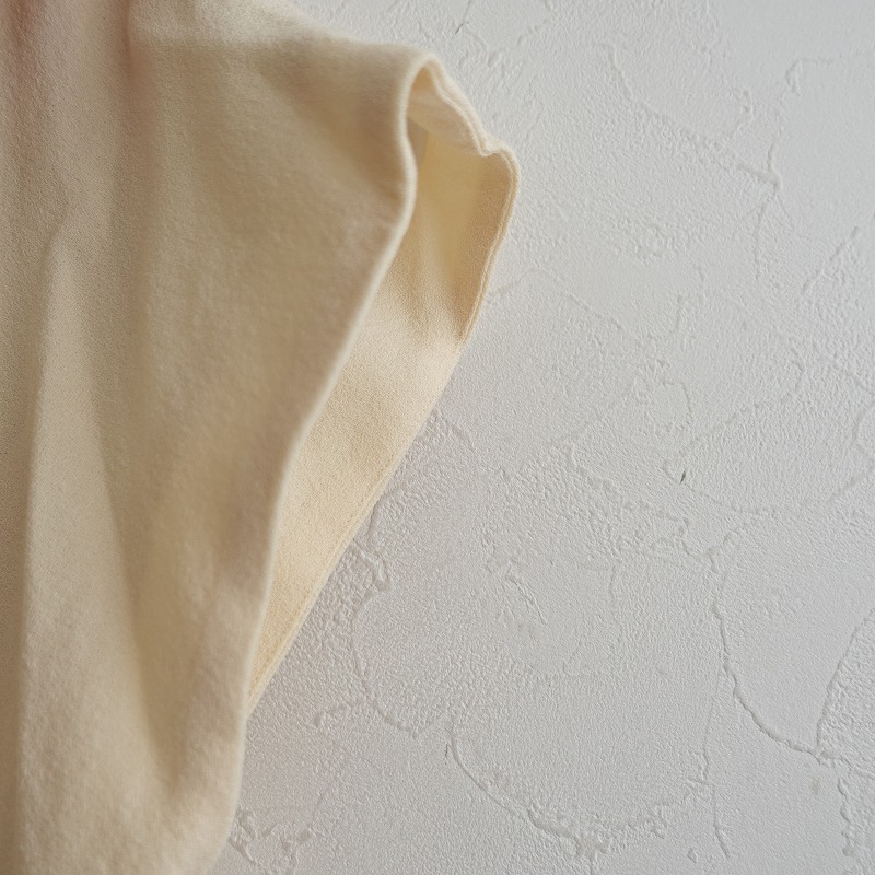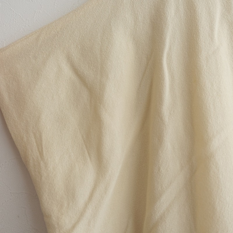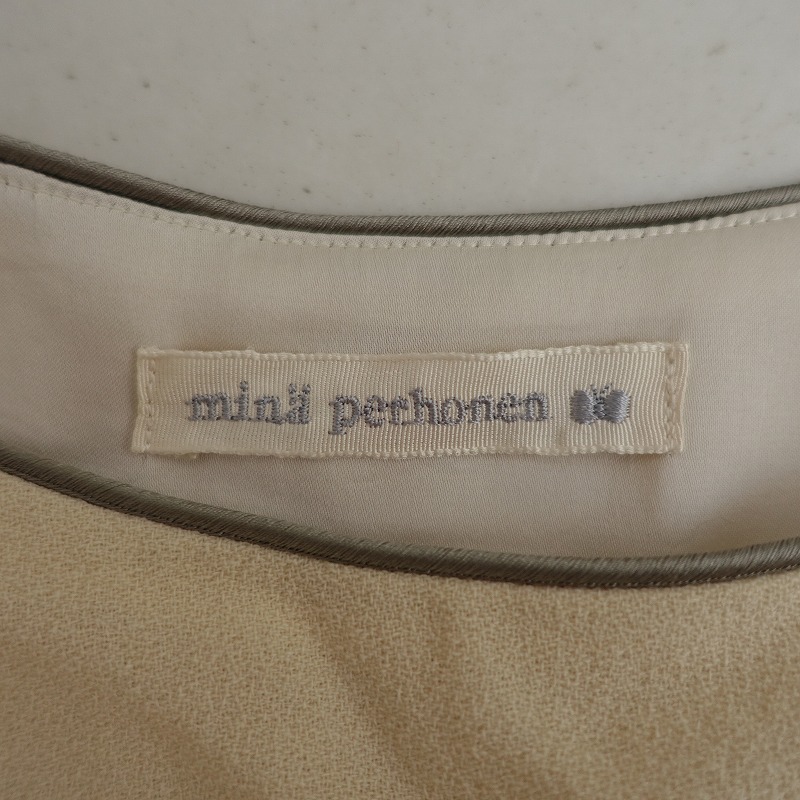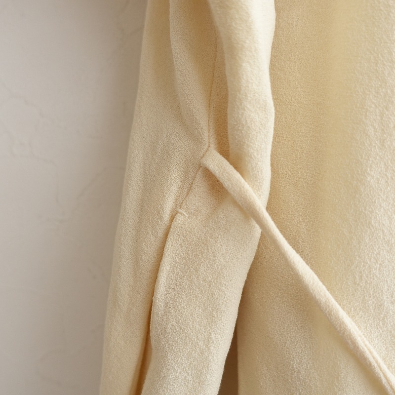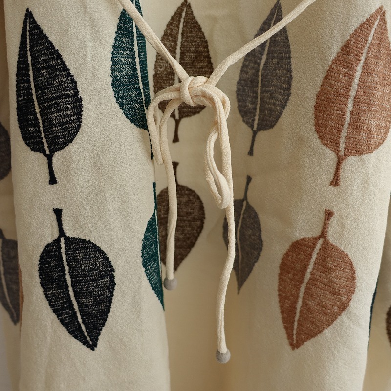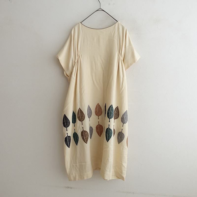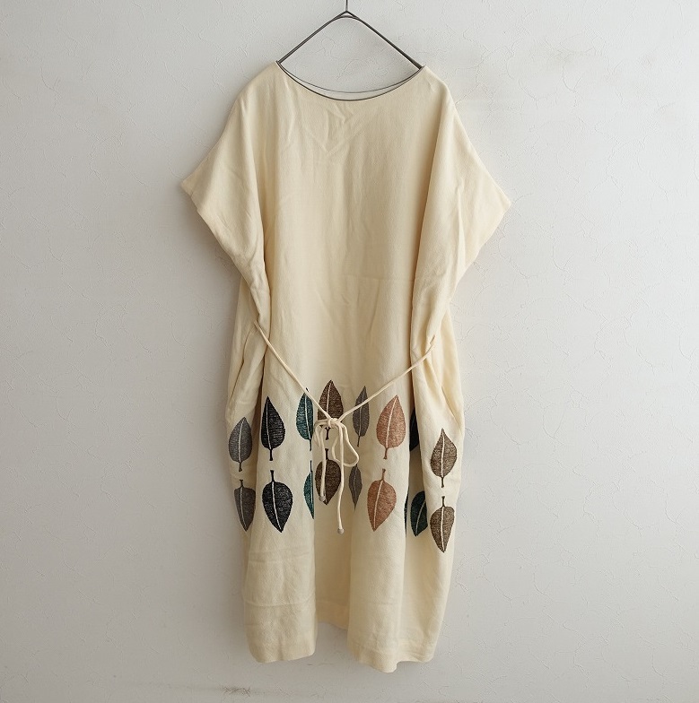 mina perhonenのhappa ウールジョーゼット刺繍ドレスワンピースです。カラーはクリームでジョーゼット地で仕立てられており、ブラック・グリーン・ブラウン・グレー・ベージュで葉っぱの刺繍があしらわれており、裏地が付いております。フレンチスリーブデザインで、両サイドにシームポケットが付いております。バック脇下はゴム入りで、別途共布の腰ひもが付属されており、定価(メーカー希望小売価格)79,200円 税込みの商品です。 |