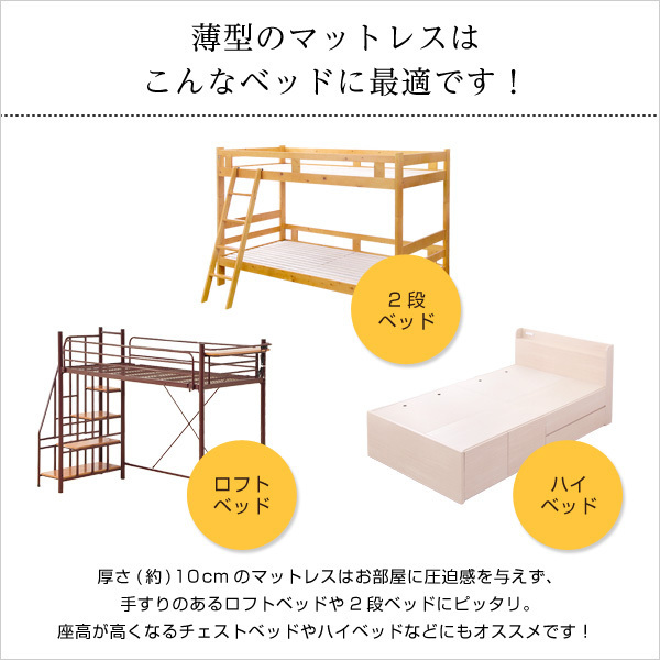 【ポイント】 ①ロフトベッドや2段ベッドにオススメの薄型のマットレスです。 ②身体を柔らかく包み込む、ポケットコイル仕様です。 ③速乾性のある構造で快適にご使用いただけます。 ④スムーズに搬入できるロール梱包でお届けします。 |