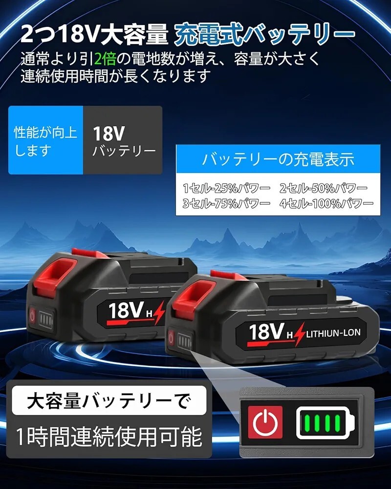 ・マキタシリーズのリチウムバッテリーとも互換性あり