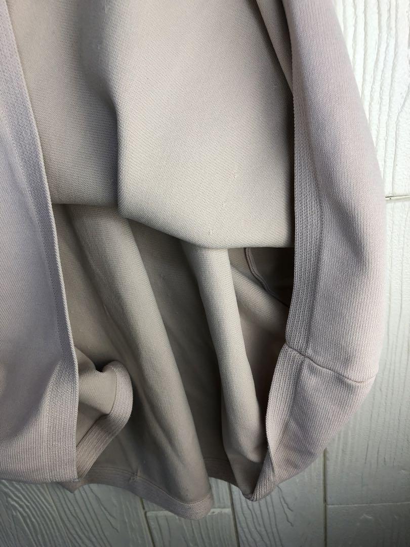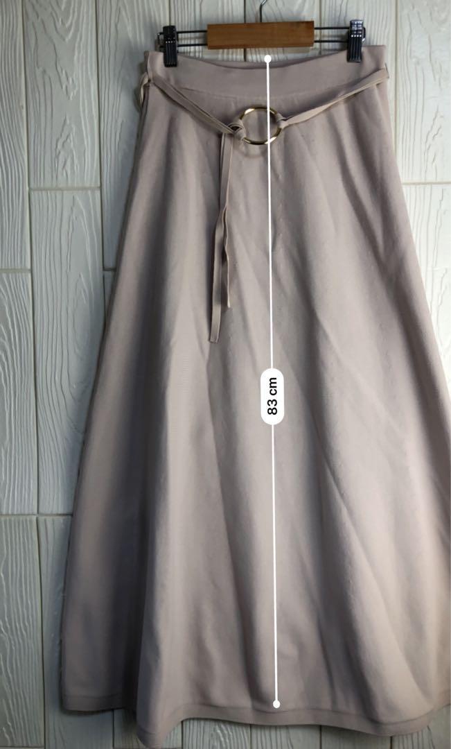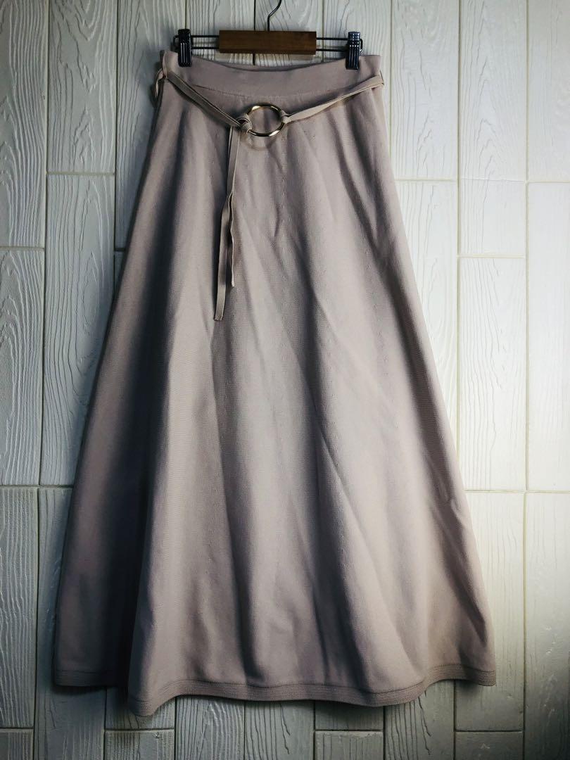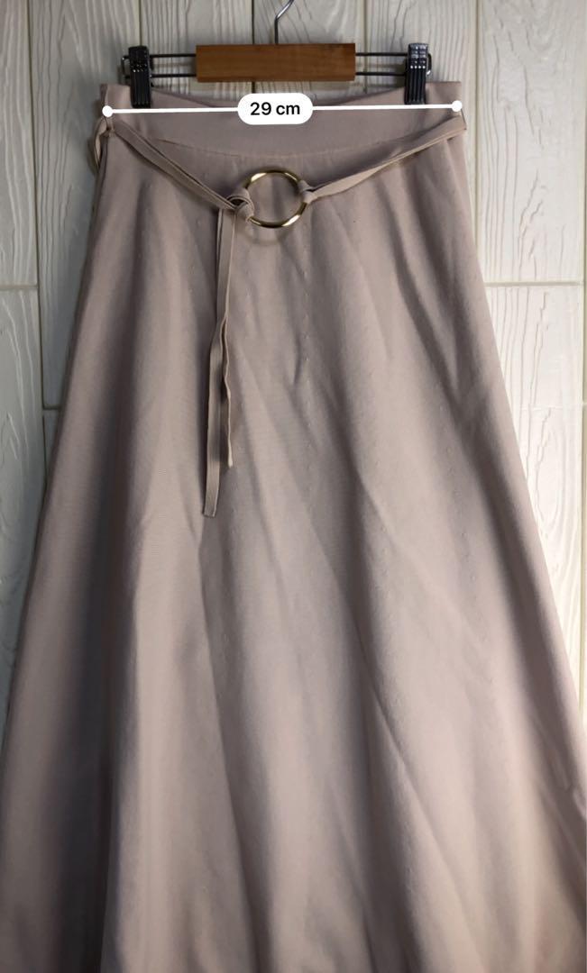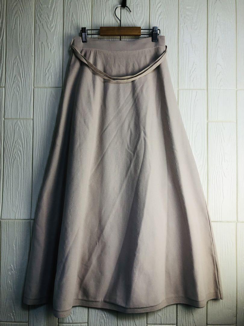 ベージュのフレアスカート、リング付きベルト付き、ウエスト58cm、丈83cm。