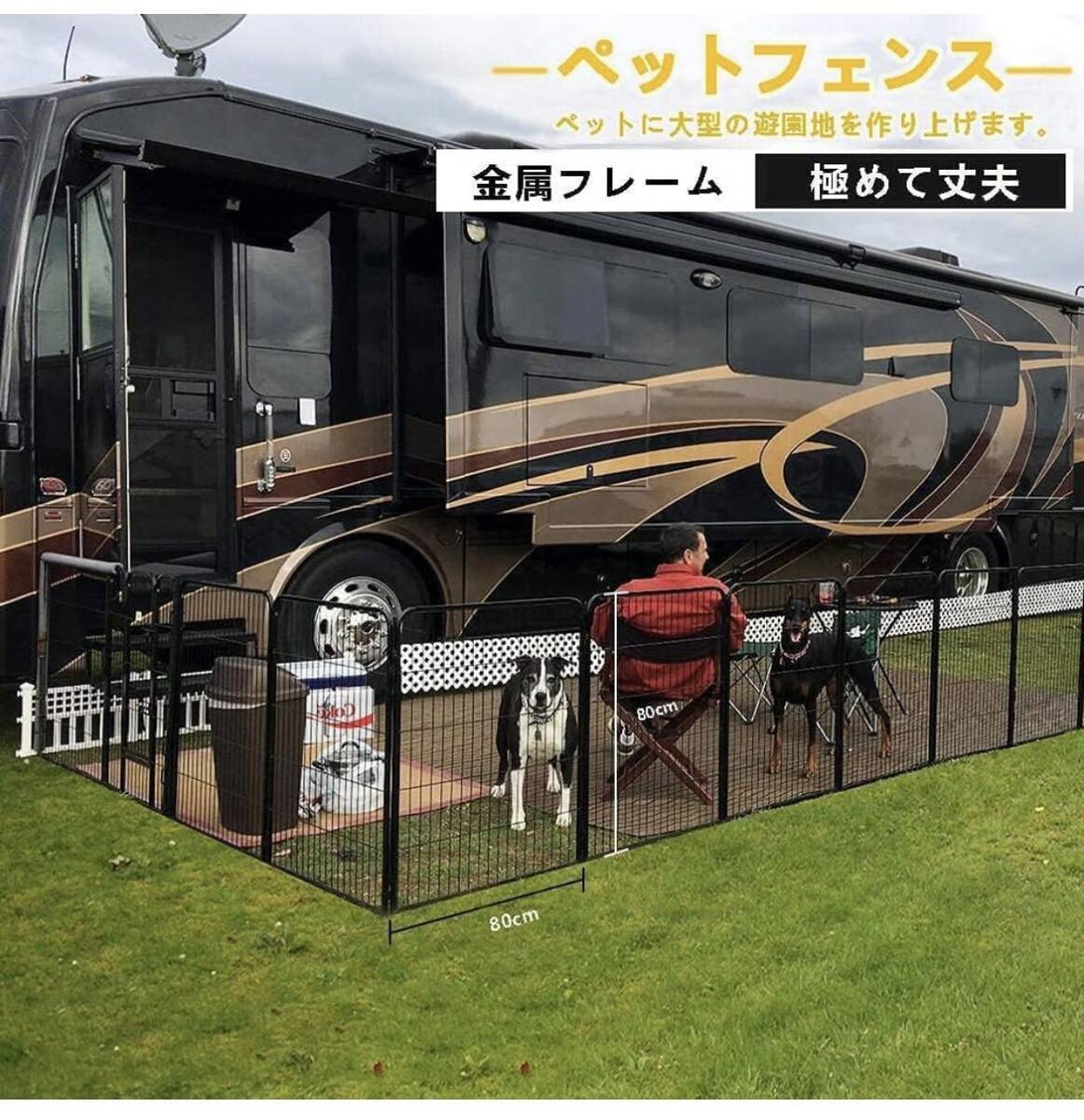• 【規格】数量:パネル7枚、入口パネル1枚、専用ロングペグ8本。全寸法(矩形):奥行240 cm × 幅80 cm × 高さ80 cm なら複数本のゲートを組み合せばもっと大きなフェンスを作れます。