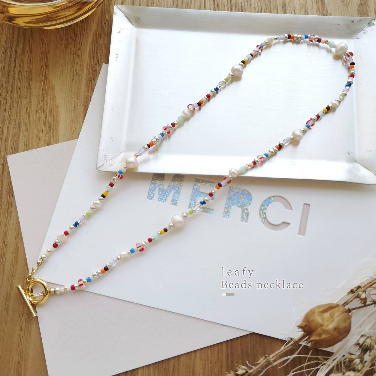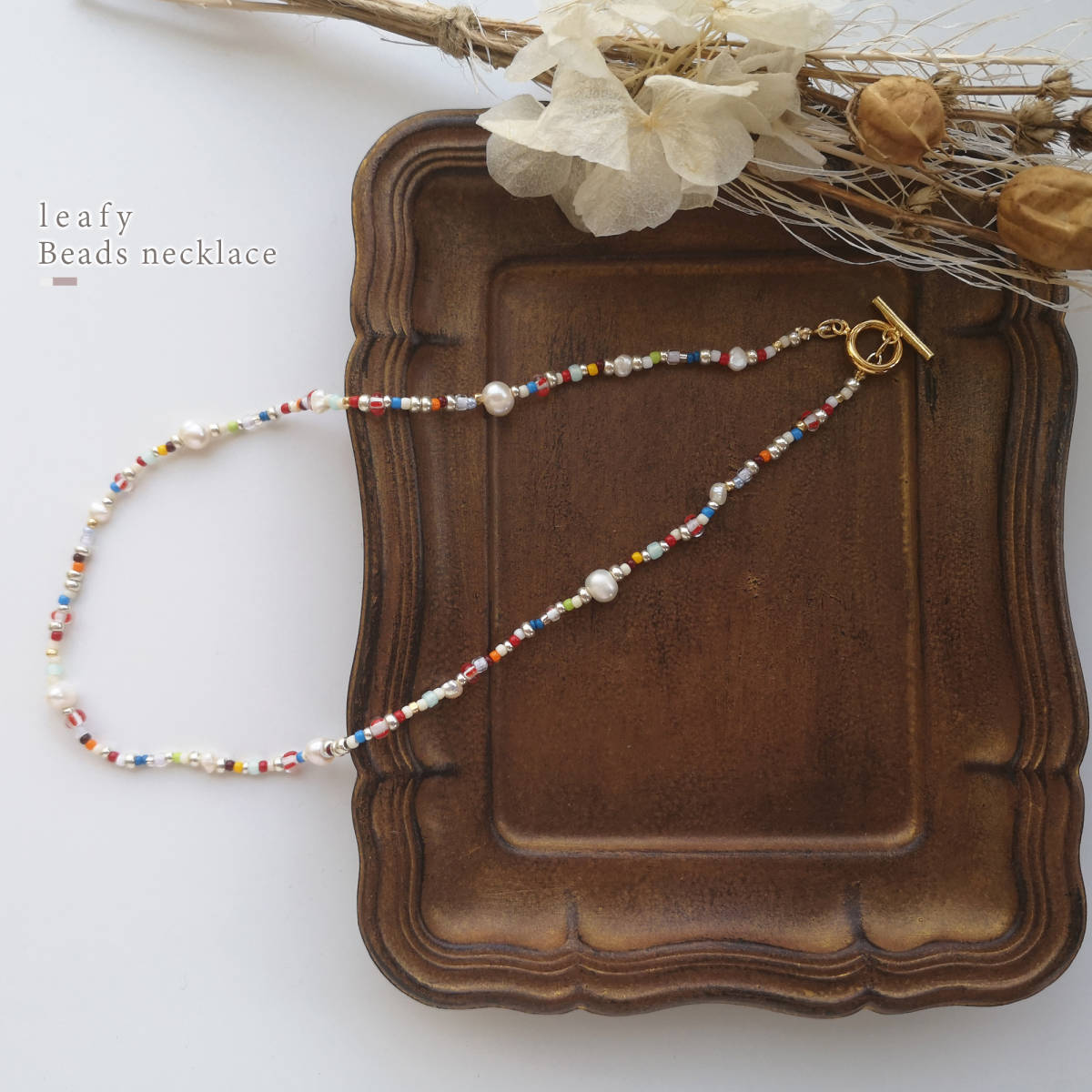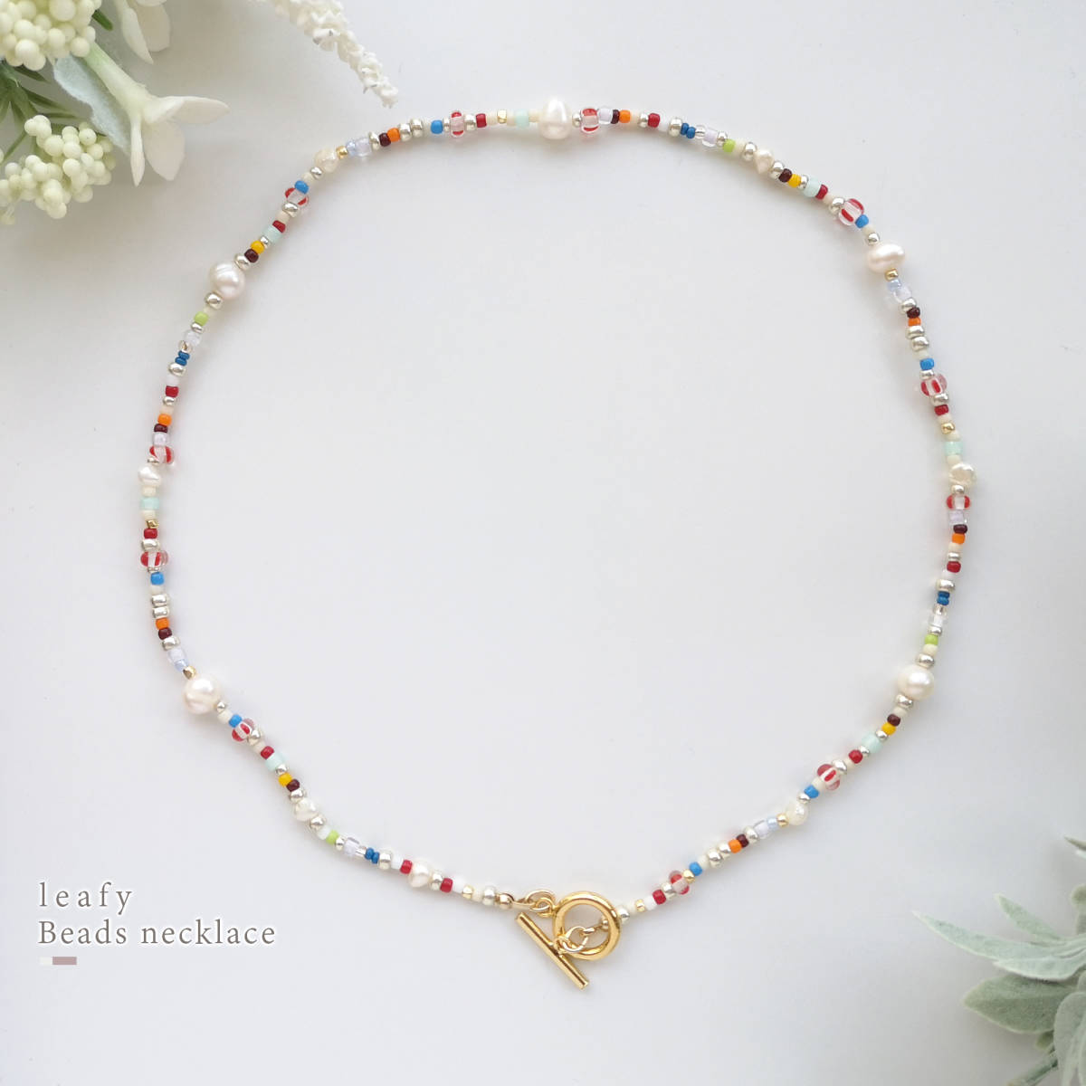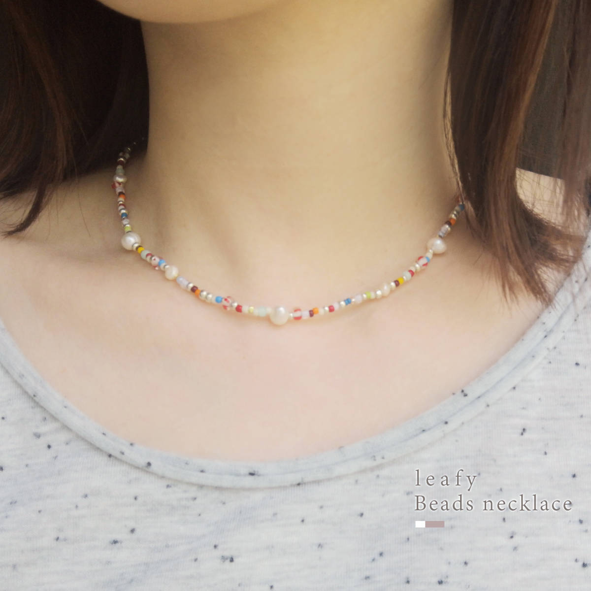 様々な種類のビーズと、淡水パールを合わせた遊び心溢れるビーズネックレスです。