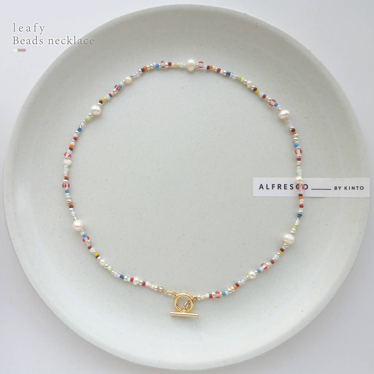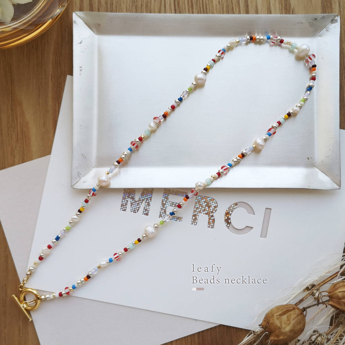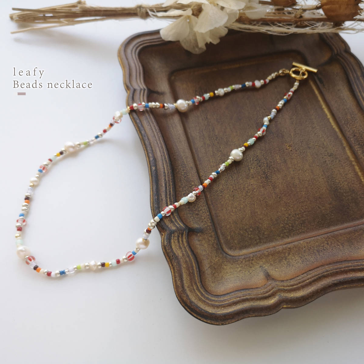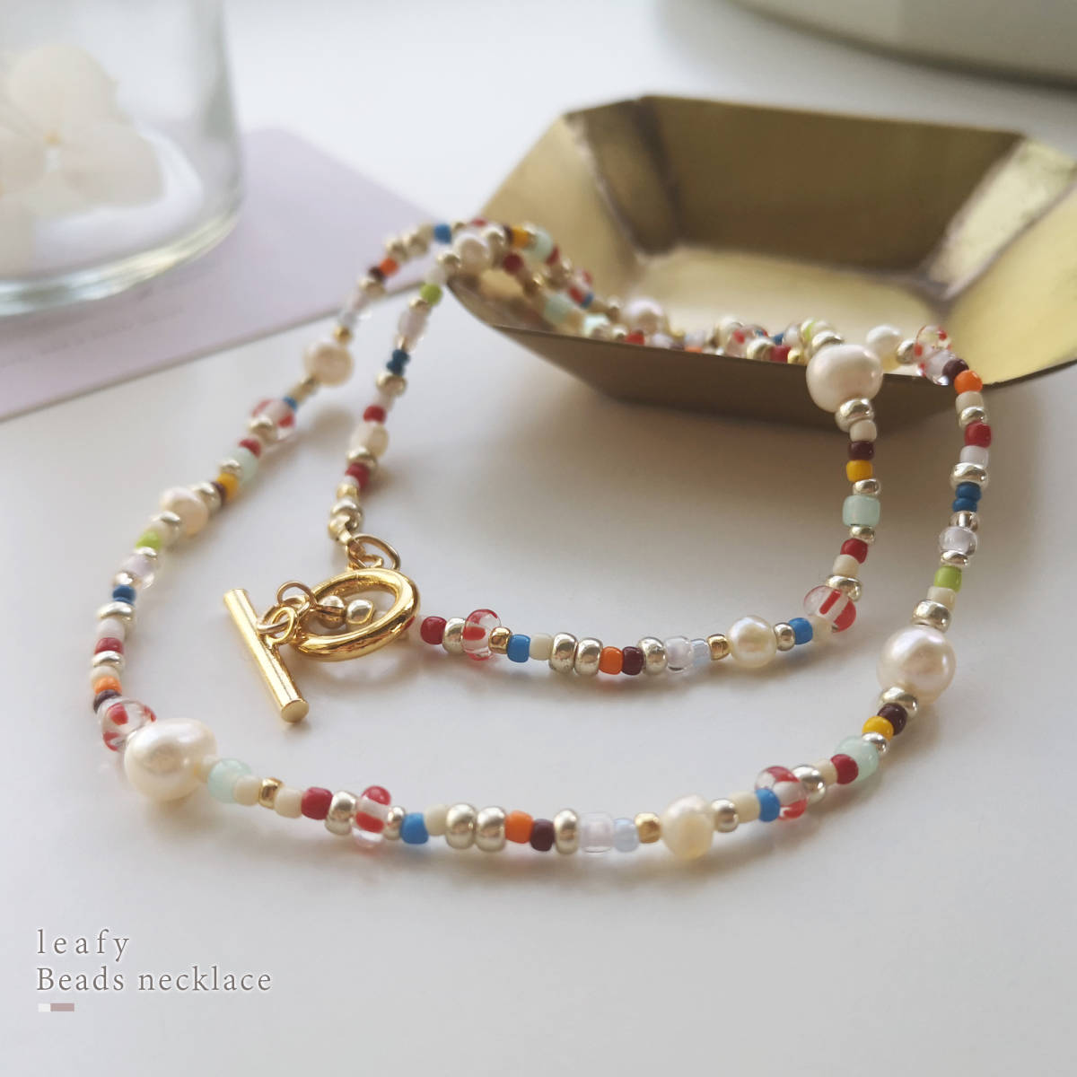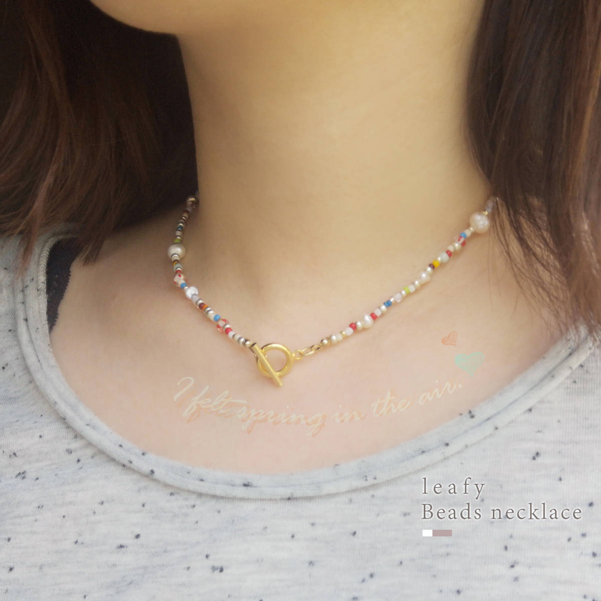 様々な種類のビーズと、淡水パールを合わせた遊び心溢れるビーズネックレスです。