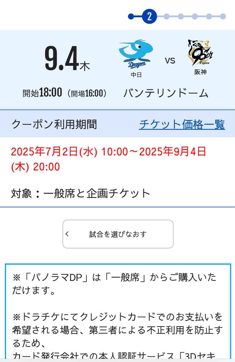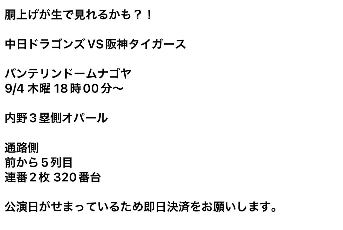 9/4(木)通路側2枚 前から5列目 中日ドラゴンズ対阪神タイガース 内野3塁側ペア 320番台 定価以下スタート