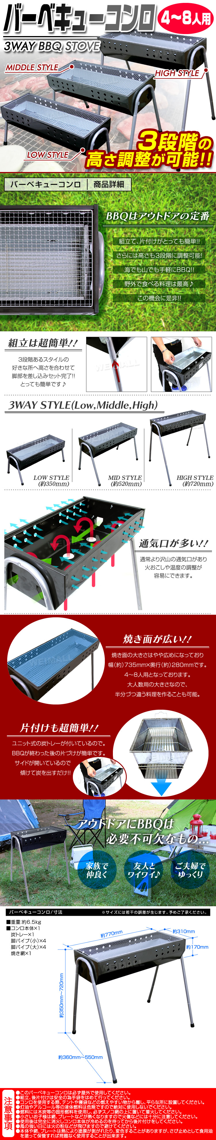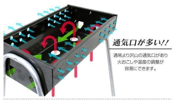 大人数でのバーベキューに最適なBBQコンロ! 簡単設置&コンパクト! 通気口が多いので火起こしがラクラク! 焼き面積の大きさはやや広めになっており、半分づつ違う料理を作ることも可能! お好みのスタイルに合わせて高さを調節することができます。 炭トレイが付いているので、後片付けラクラク! 脚部を本体に収納できるので、コンパクトになり持ち運びに便利です。 みんなで楽しくバーベキューを! キャンプでのバーベキューはもちろん、海でも庭でも幅広くお使いいただけます 【仕様】 サイズ(約): ・組立時(最大):770×550×720mm ・収納時:830×180×320mm ・網サイズ:735×280mm 重量(約):6.5kg 材質:スチール、クロームメッキ他 適正人数:4~8人 ●商品内容 本体 バーベキュー網 炭トレー 脚(ジョイント長4本、ジョイント短4本) |