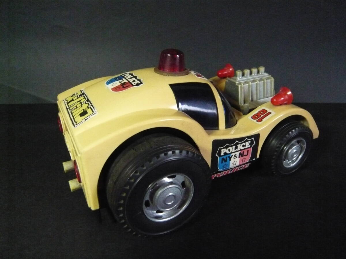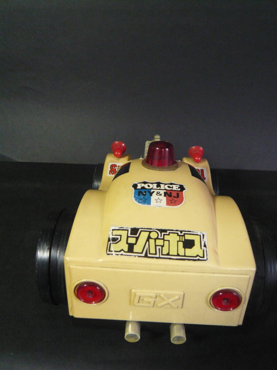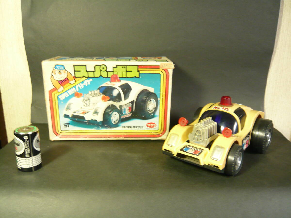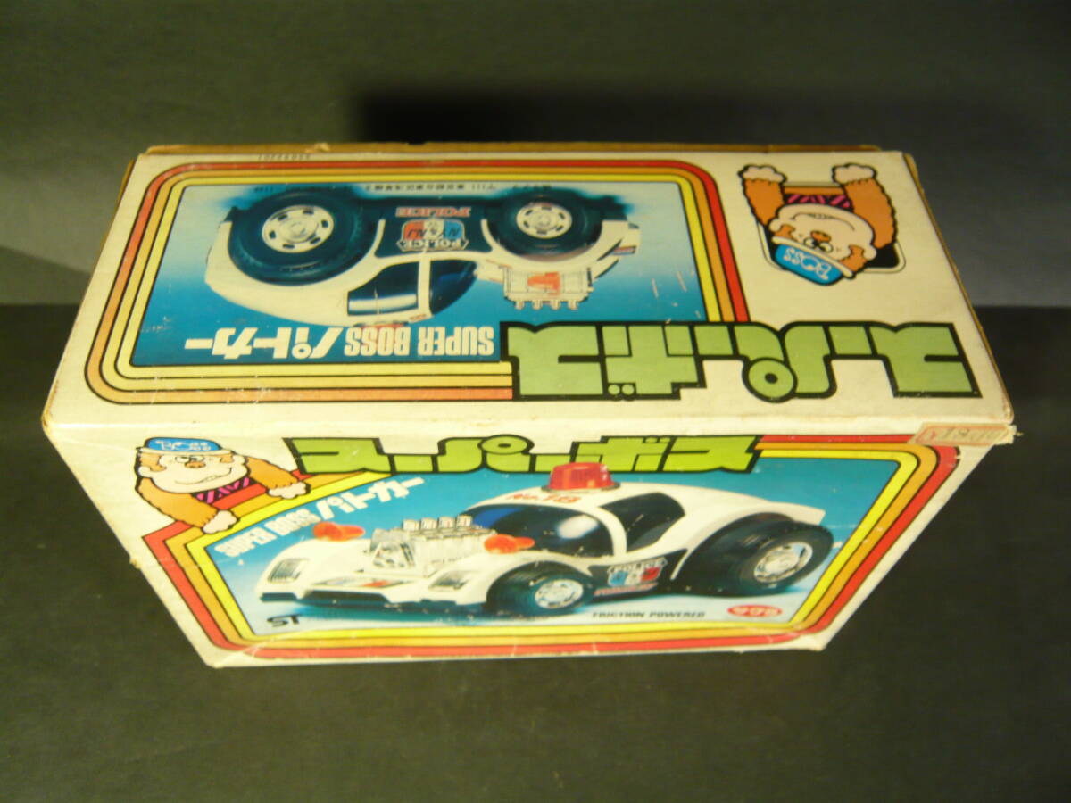 箱入りのSUPER BOSSパトカーです。パワーは、フリクションパワーです。箱のサイズは、縦約10センチ、横約22センチ、奥行き約14.5センチ、パトカーのサイズは、高さ約9.8センチ、長さ約20センチ、奥行き約13.3センチです。箱には、多少の劣化が見られますが、破損の状態はありません。フリクションパワーで前に走らせると、同時にエンジンが左右に動きます。