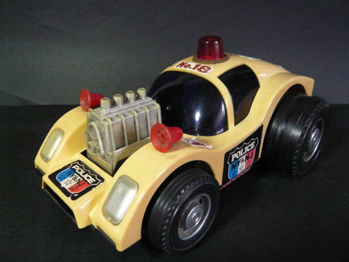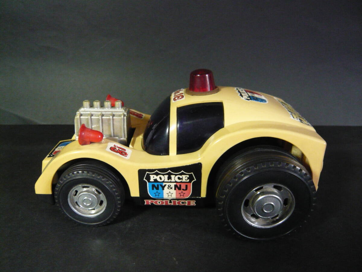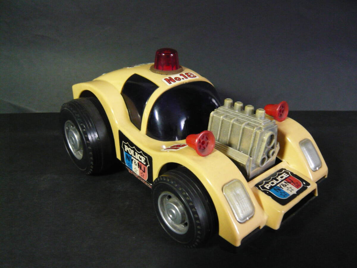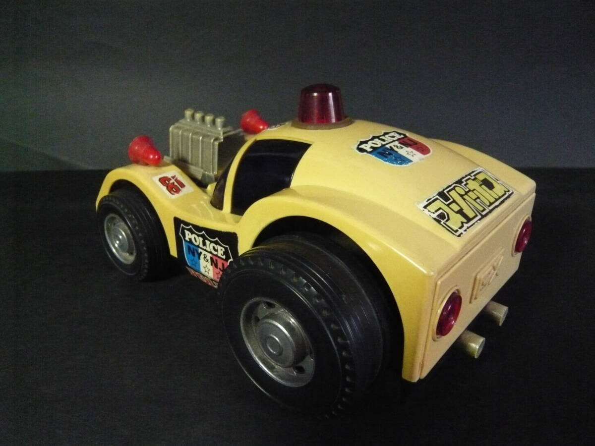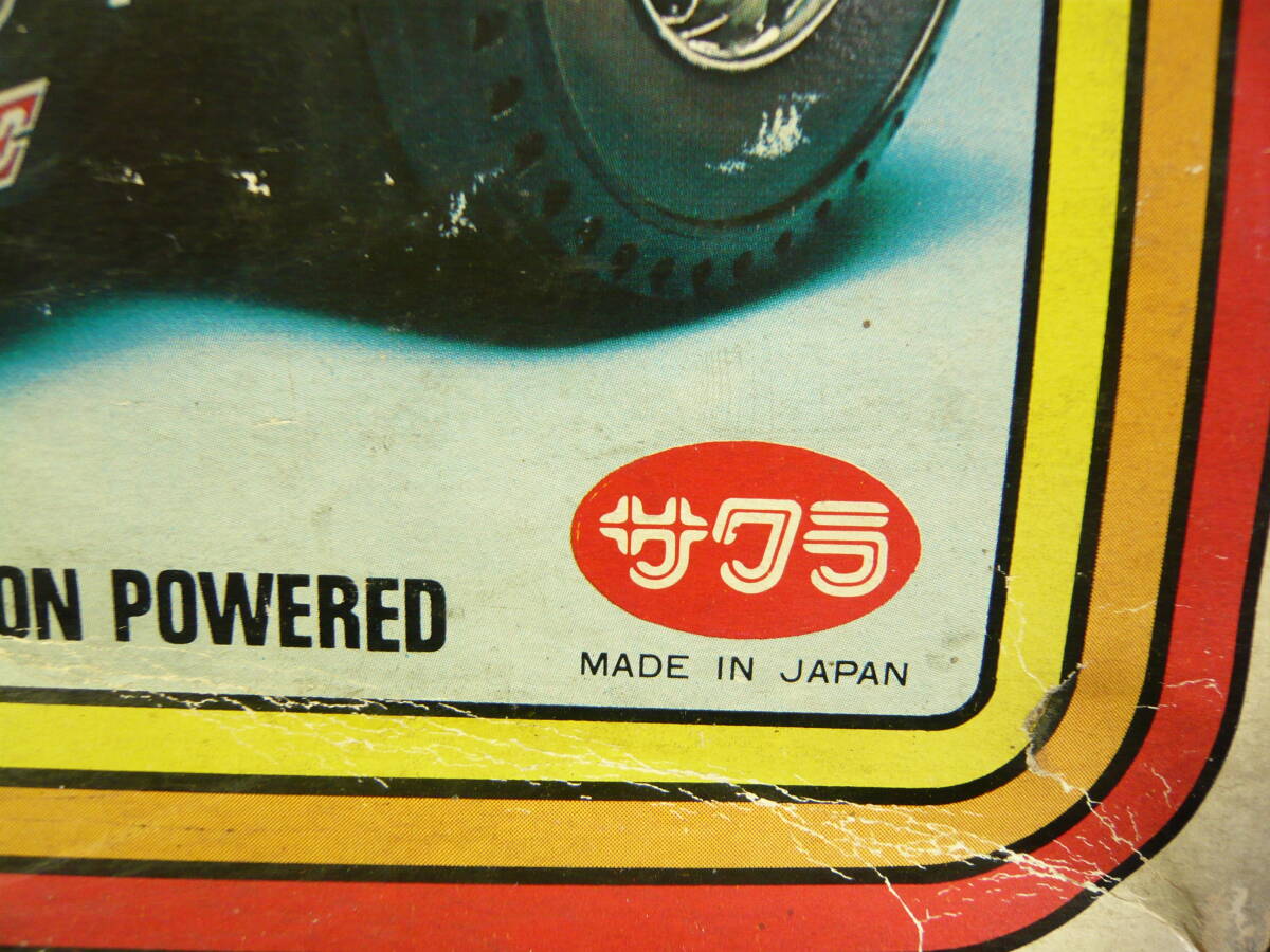 箱入りのSUPER BOSSパトカーです。パワーは、フリクションパワーです。箱のサイズは、縦約10センチ、横約22センチ、奥行き約14.5センチ、パトカーのサイズは、高さ約9.8センチ、長さ約20センチ、奥行き約13.3センチです。箱には、多少の劣化が見られますが、破損の状態はありません。フリクションパワーで前に走らせると、同時にエンジンが左右に動きます。