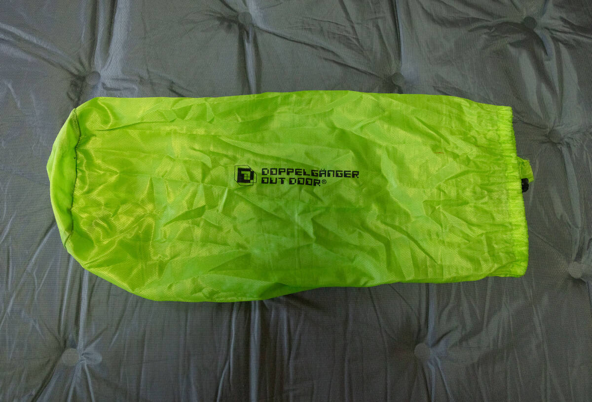 DOPPELGANGER OUTDOOR ドッペlギャンガー (現在のDVD)のキャンプ用インフレータブルマット サブルサイズです。広げるとダブルサイズですが、一人でゆったり練るにハちょうど良いサイズです。二つ折りにして、収納するかたちなので、内部のウレタン構造は、同時出品のシングルより柔らかいですが、寝返りが打てる充分は幅があるので、リラックスできます。