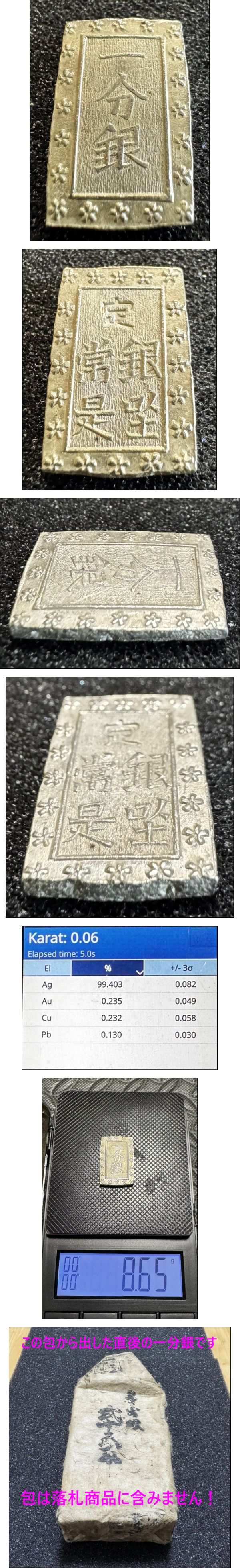 商品説明 | 【商品内容】 希少 【天保一分銀 Ps】 包出し 美品 表P型で【Ps】は少しレアだと思います。 【品位】 銀99.403%/金0.235% OLYMPUS VANTA 蛍光X線分析計機 (約400万円)で測定。 鑑定結果は写真に掲載しています。 【量目】:8.65g 【状態】: 銀座オークションにて落札した一分銀、包出しです。 一分銀の包を開封した中の品物です。 画像にある包の中から出しました。 包は落札商品に含みません! 【天保一分銀 Ps】となります。 コンディションは写真でご判断ください。 現状で気に入っていただける方のみお願い致します。 計量器は安価な物ですので多少の誤差はあると思います。 発送は【おてがる配送ゆうパケットポスト】を選んでいただき コインホルダーに入れ、プチプチに包んで発送いたします。 ◆あくまで個人保管品です。 画像にてご判断いただき、ご納得いただける方のみご入札をお願い致します。 また画像には限りがございますので、色味が異なる場合などあるかもしれません。 詳細部分にこだわる方、完璧をお求めになる方、状態に神経質な方もご遠慮願います。 商品状態に関しては個人差がございます。 落札後の商品状態による返品や故障時の補償は一切お断りいたします。 (すり替え防止の為) ◆不要なトラブルを避けるため、3日以内のご決済、 速やかな受け取り連絡をお守り頂ける方のみとしております。 あらかじめご了承ください。 お守り頂けなかった場合、落札者都合キャンセルとさせていただきます。 以上、全てをご了解いただける方のみご入札をお願い致します。 ■新規の方及び、評価が低い方の入札は取り消させていただく場合がございます。 ■領収証の発行は対応しておりません。 |