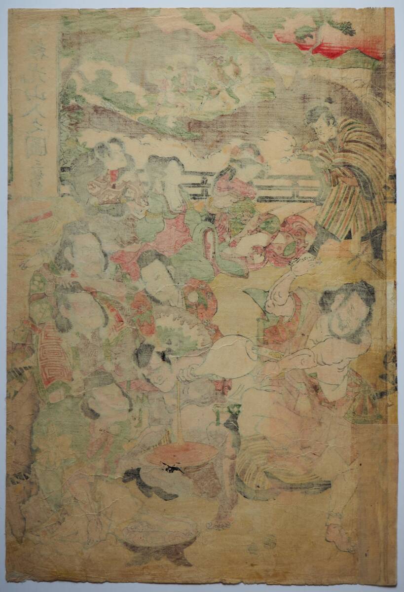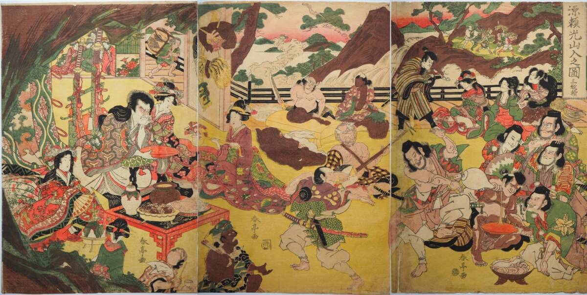 “Minamoto no Yorimitsu (Raiko) and his retainers drinking sake with the demon Shutendoji at Mount Oe, triptych “, Circa. 1818