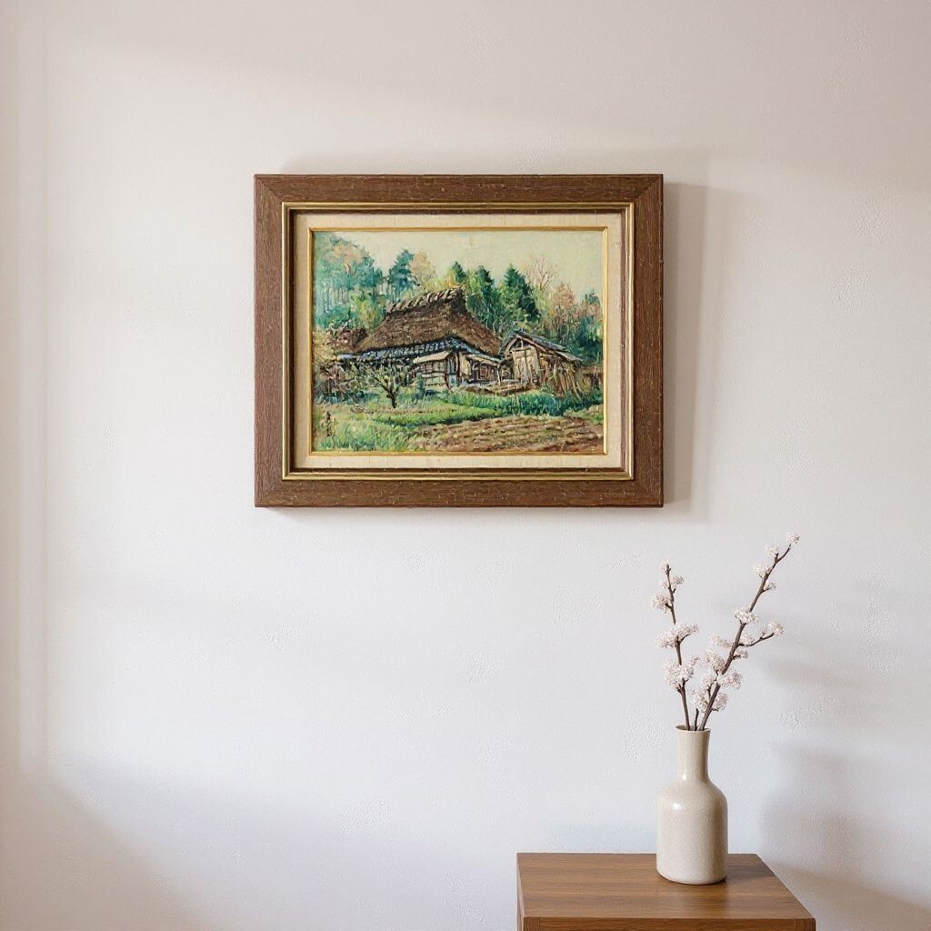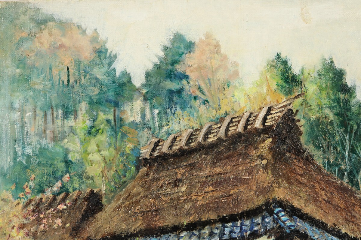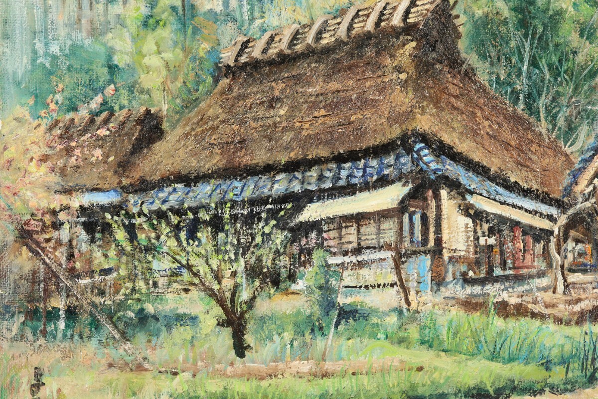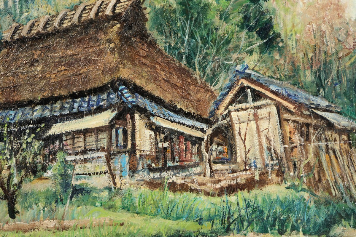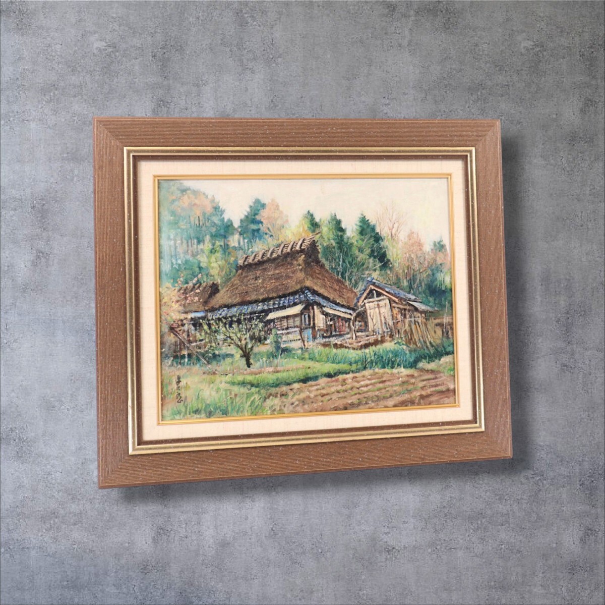 真作 林与三郎 油彩「丹波 梅迫の里」画寸 F6 三重県出身 二元会理事 京都府綾部市 萱葺き屋根の古民家と田畑のある日本の原風景 11311