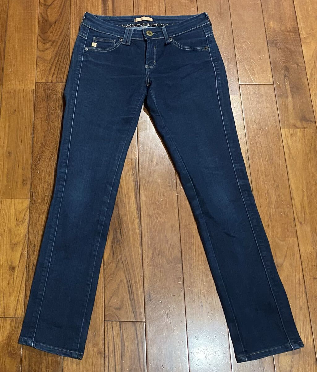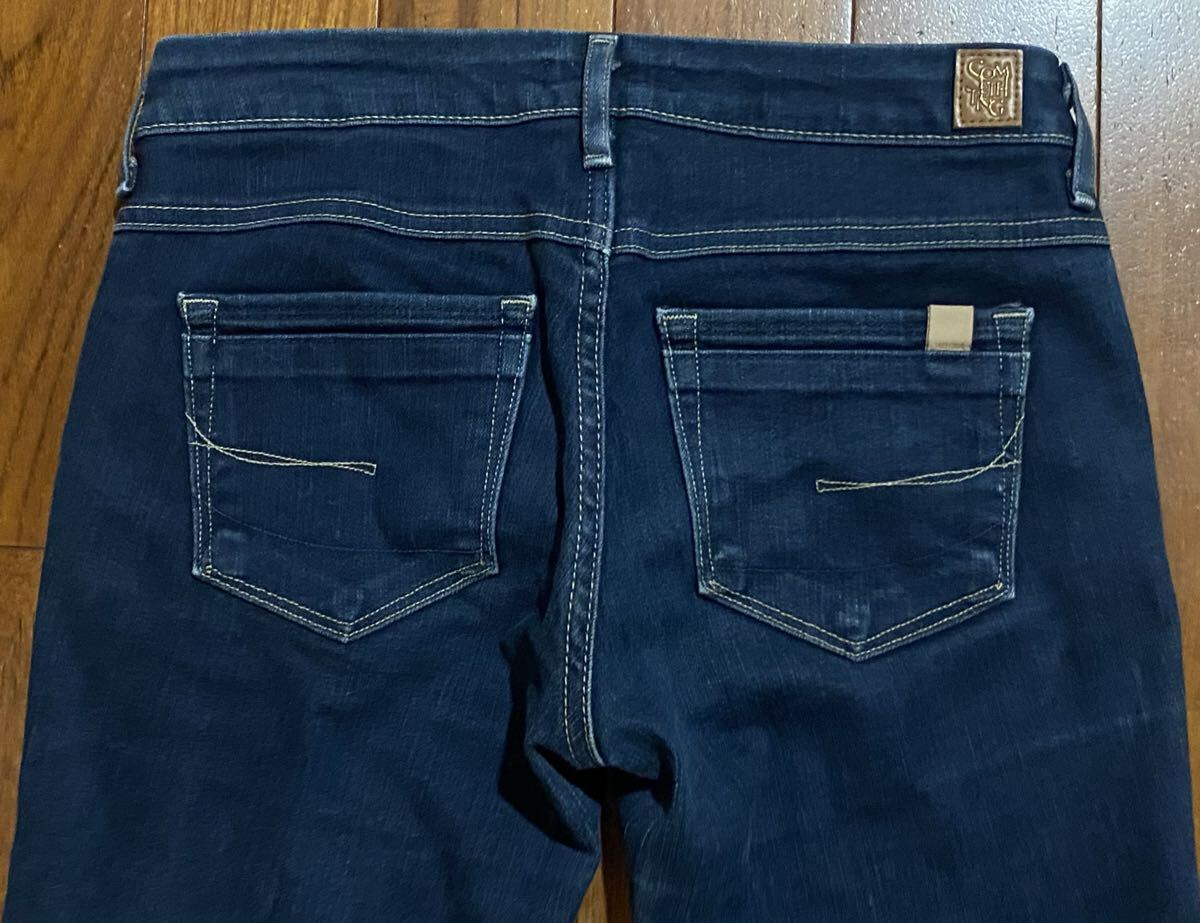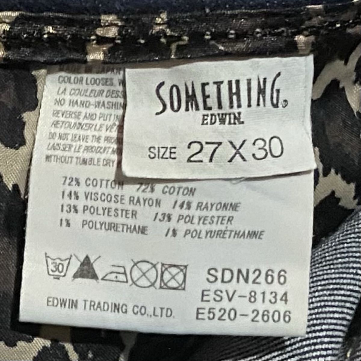 サムシングのストレッチスキニーデニム(ジーンズ)、SDN266 ESV-8134 E520-2606です。色はインディゴブルーです。USEDで裾直ししておりますが状態は良いです(10段階中8程度)。ジッパーフライです。生地はストレッチ入りで綿72%、レーヨン14%、ポリエステル13%、ポリウレタン1%です。正規品です((株)エドウィン、日本製)。サイズはW27でウエストは重ねずに平置きで約68cm、ヒップ約84cm、股上約18cm、股下約71cm、股下15cmのふともも部分約41cm、裾まわり約28cm、重量約430gです。発送はゆうパケットポストになります。