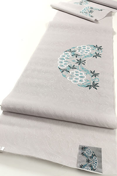 やや透け感のあるハリのある帯地は白鼠色のお色目でございます。帯地にはゆらゆらとした湯気のような形の地紋が施されております。
