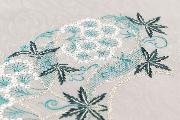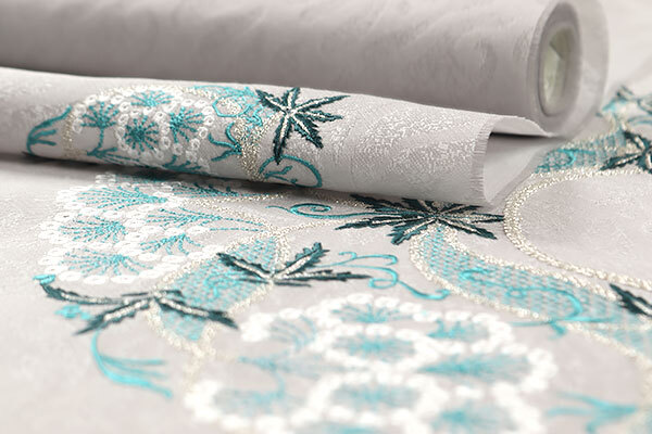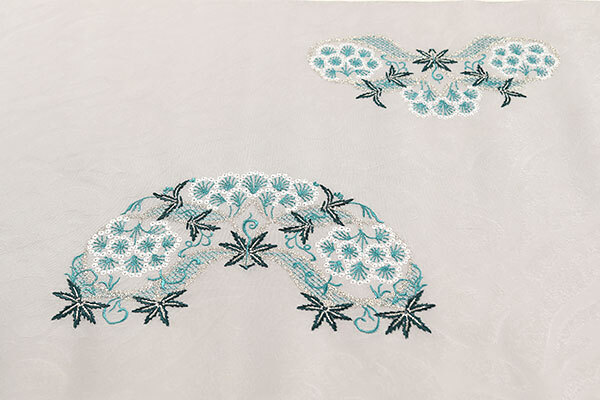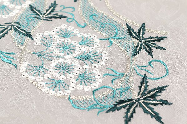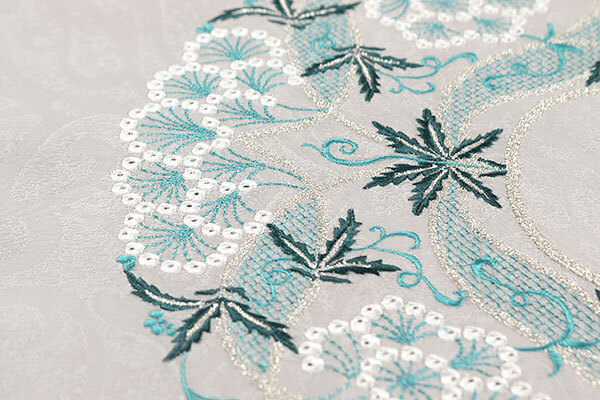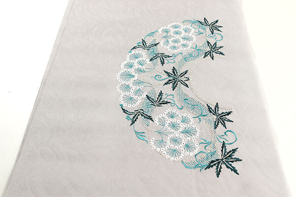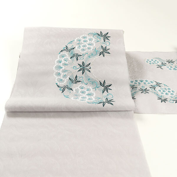 お太鼓や胴部分には、白色、浅葱色、暗い青緑色、銀糸などのお色目で、花をアレンジしたような模様が刺繍されております。