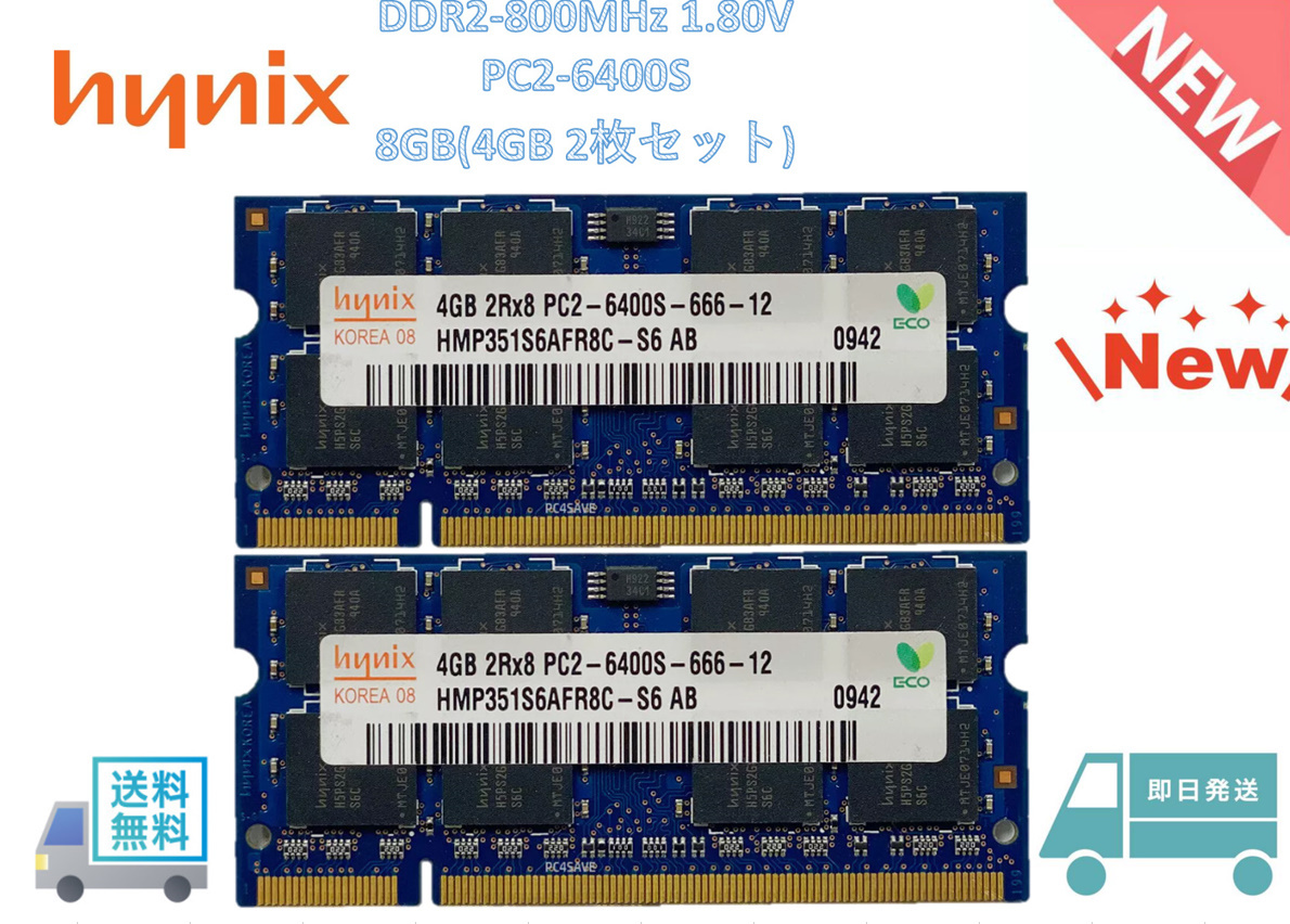 新品未使用 ハイニックス hynix 8GB(4GB×2枚) DDR2 800MHz PC2-6400S SODIMM 200pinラップトップメモリRAM 送料無料