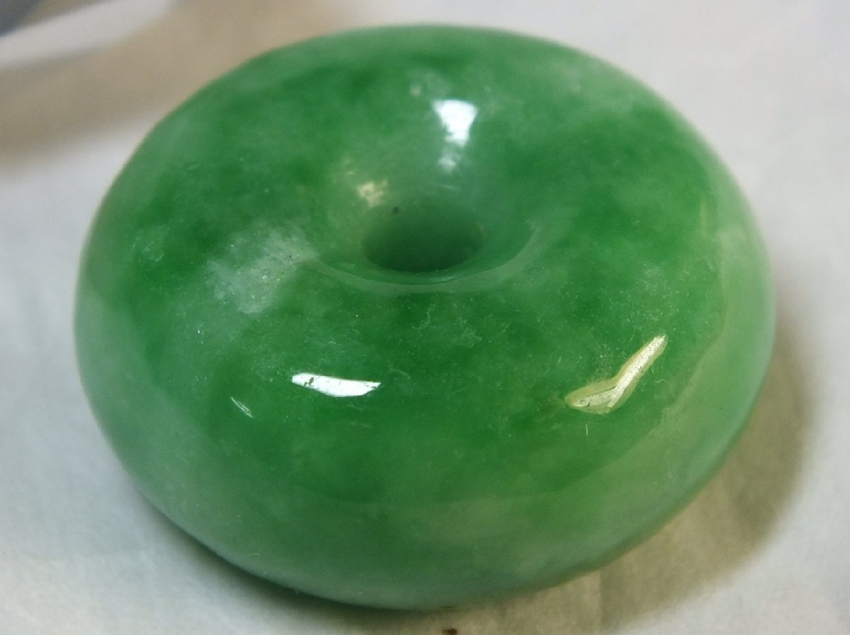 ▲商品説明▲ | サイズ:直径27×厚12mm 重さ:18.1g 緑色が綺麗なミャンマー翡翠。中央に直径約4mmの貫通穴が有ります。石コレクションやアクセ作り等に。 ☆商品につきましては注意を払った検品を行っておりますが、稀に石の表面にクラック状の筋や凹みが見受けられる場合が御座います。それは石本来の石紋で傷ではありません(割れが生じ易いヒビではありません)。返品の対象にはなりませんのでその旨御了承の上、ご検討下さい。 |