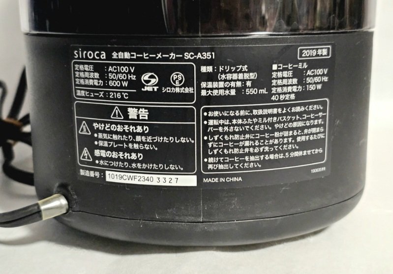 | siroca シロカ 全自動コーヒーメーカー SC-A351 カフェばこ ドリップ方式 コーヒー豆/粉両対応 家庭用 2019年製 HMY |