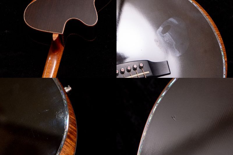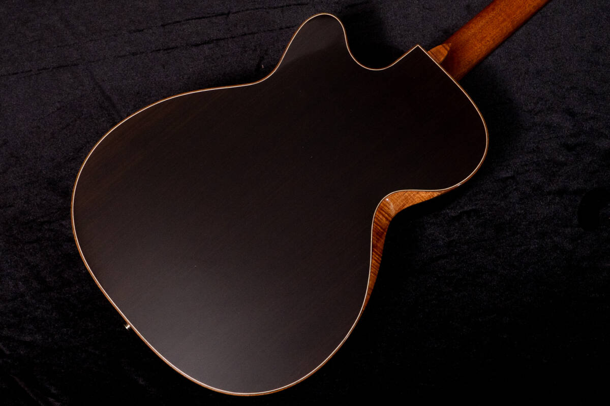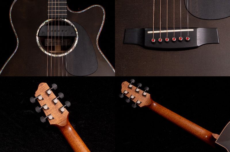dark brown風のカラーニング、ボディバインディング、コンター部分やヘッドバックはHawaiian Koa、ロゼッタはアバロンを採用し非常に高級感のあるルックスを持ちます。