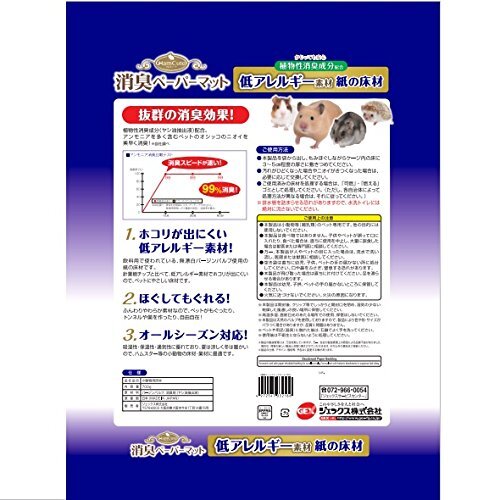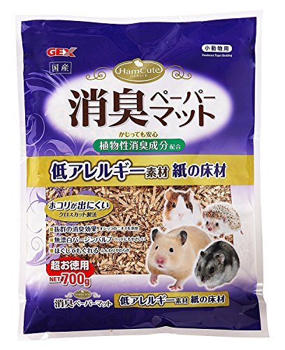 商品紹介 低アレルギー素材の紙の床材 ホコリが出にくいクロスカット製法 かじっても安心な植物性消臭成分(ヤシ油抽出液)配合。アンモニアを含むペットのオシッコの臭いをすばやく消臭。GEX調べ ・抜群の消臭で、気になるオシッコの臭いを消臭。 ・ペットにもやさしい、無漂白バージンパルプ。 ・ふんわりやわらかなのでペットが簡単にほぐしてもぐれる。 ・・・飲料用で使われている、無漂白バージンパルプ使用の紙の床材です。針葉樹チップと比べて、低アレルギー素材でホコリが出にくいので、ペットにやさしい床材です。 ・・・ふんわりやわらか素材なので、ペットがもぐったり、トンネルや巣を作ったり、自由自在。 ・・・吸湿性・保温性・通気性に優れており、夏は涼しく冬は暖かいので、ハムスター等の小動物の床材・巣材に最適です。 使用上の注意 本製品は開封後、クリップ等でしっかりと開封口を閉め、湿気の少ない乾燥した風通しの良い場所に保管してください。高温多湿、直射日光のあたる場所での使用、保管はしないでください。本製品は天然のパルプを使用しておりますので、製品により色や形・サイズがバラつく場合がありますが、品質に問題はありません。 原材料・成分 バージンパルプ、消臭剤(ヤシ油抽出液) 使用方法 ・本製品を袋から出し、もみほぐしながらケージ内の床に3~5cm程度の厚さに敷きつめてください。 ・汚れがひどくなった場合やニオイがきつくなった場合は、必要に応じて交換してください。 ・ご使用済みの床材を処理する場合は、「可燃」・「燃える」ゴミとして処理してください。(ただし、各自治体によって処理方法が異なる場合は、それに従ってください)