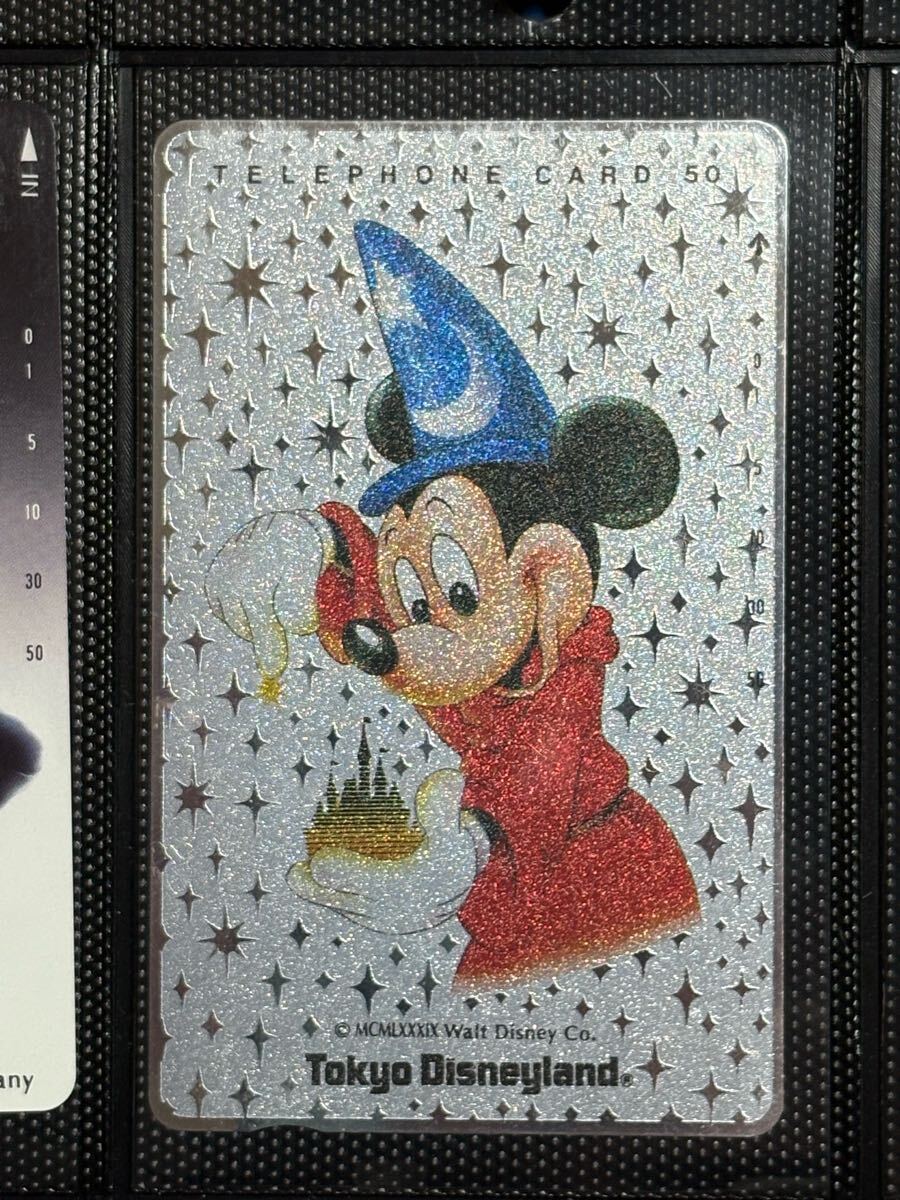 ディズニー映画『ファンタジア』でおなじみの魔法使い姿のミッキーマウスが描かれた、東京ディズニーランドのテレホンカードです。キラキラと光るホログラム仕様で、背景には星がちりばめられ、幻想的な雰囲気が魅力です。手のひらに浮かぶお城の演出も印象的で、ディズニーファン必携の華やかなコレクターズアイテムです。