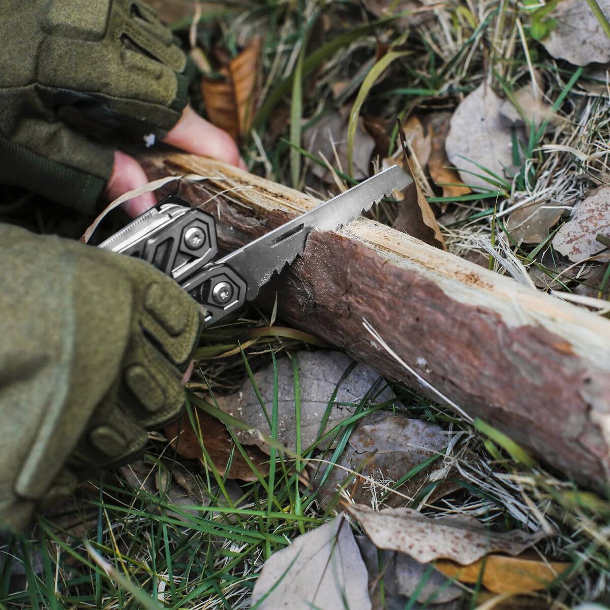 【21-in-1多機能】定番のペンチ、プライヤー、ワイヤーカッター(切断対象:φ1mm、硬度HRC30までのワイヤー)、直刃、波刃、ノコギリ、ドライバー、メジャー、缶切り、栓抜き、リーマ機能以外、ビットホルダーと両頭ビット4枚(-4x‐6、PH1xPH2、PH0x-2.5、T10xT15))を追加して、キャンプ、釣り、徒歩などのアウトドアからお家の防災グッズや車載工具まで幅広く対応できます。