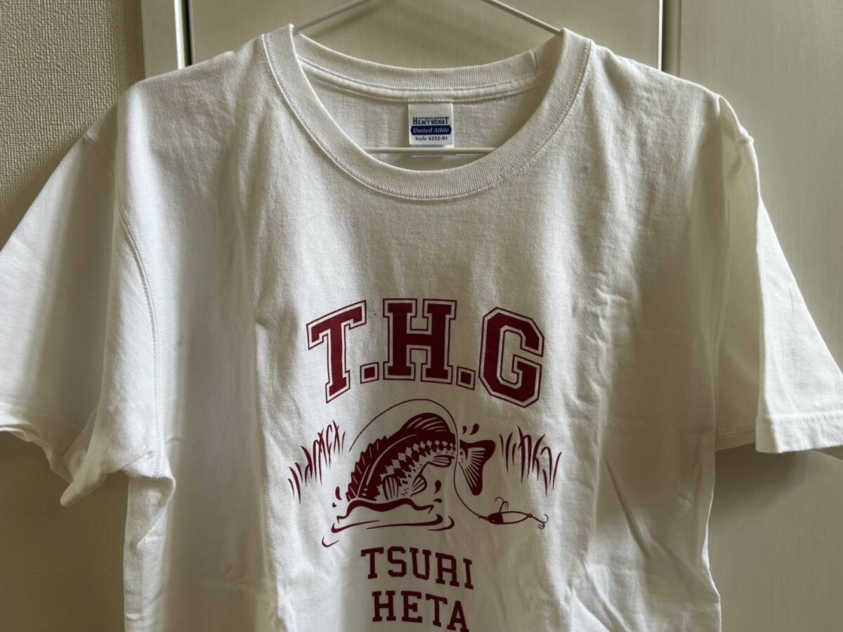 T.H.G TSURI HETA Tシャツ バス釣り カレッジロゴ風 SIZE L United Athle 中国製 綿100% キャブ株式会社 右胸に少汚れ有 白色ホワイト系