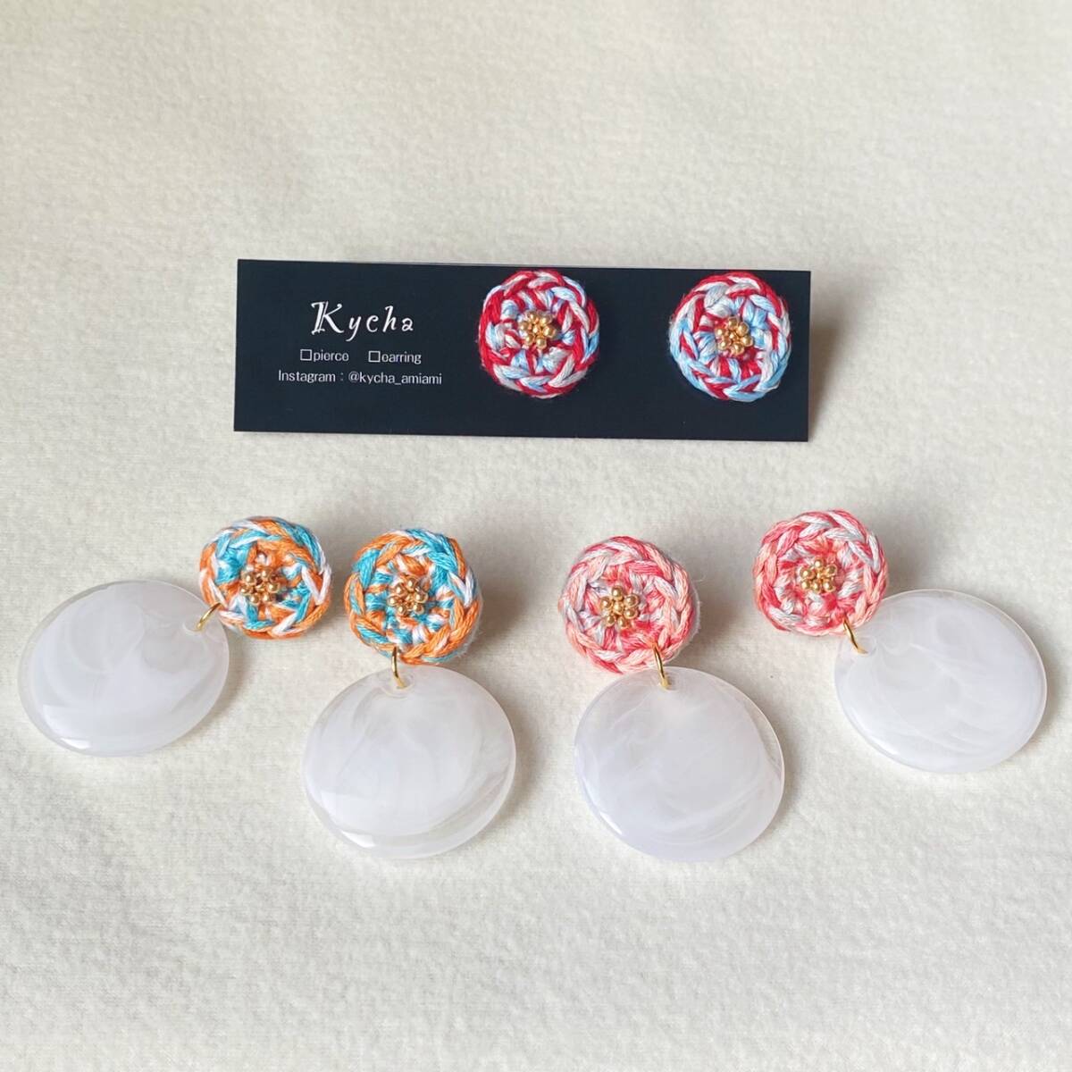 【K111】おはじき風編みモチーフのイヤーアクセサリー アレルギー対応 パーツ変更可