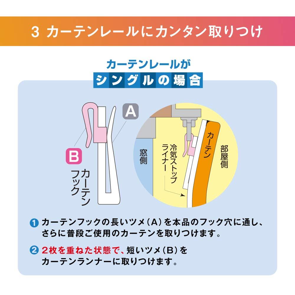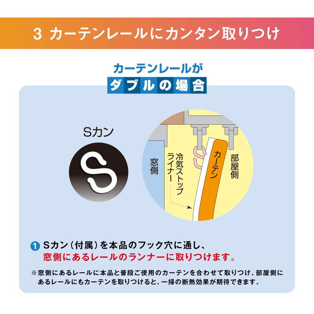 カーテンレールに取りつけるだけで足もとあったか!冷気ストップライナー!・カーテンレールに取り付けるだけで冬場は窓からの冷気を抑え、足元を暖かに・冬は室内の暖房を逃しにくく、外からの冷気をストップ!・夏は冷房の冷気を外に逃がさず、お部屋をクールキープ!超透明タイプで明るい室内!インテリアの美観を損なわず素敵に省エネ!・灯油代・冷房・暖房の電気代節約に!・直接窓に貼るタイプの断熱シートが使えない網入りガラスや真空ガラスにもOK・断熱シートを直接窓に貼りたくない、面倒な方におすすめの断熱透明カーテン【サイズ】幅100cm×高さ225cm 2枚入り【材質】シート/塩化ビニル樹脂、Sカン/ポリプロピレン