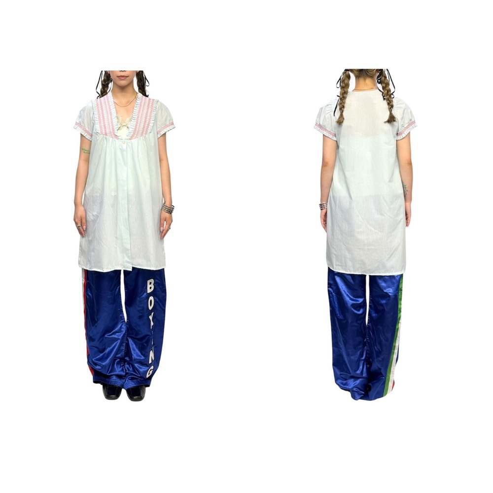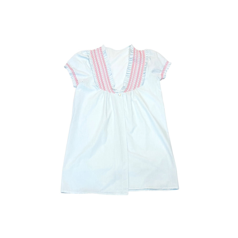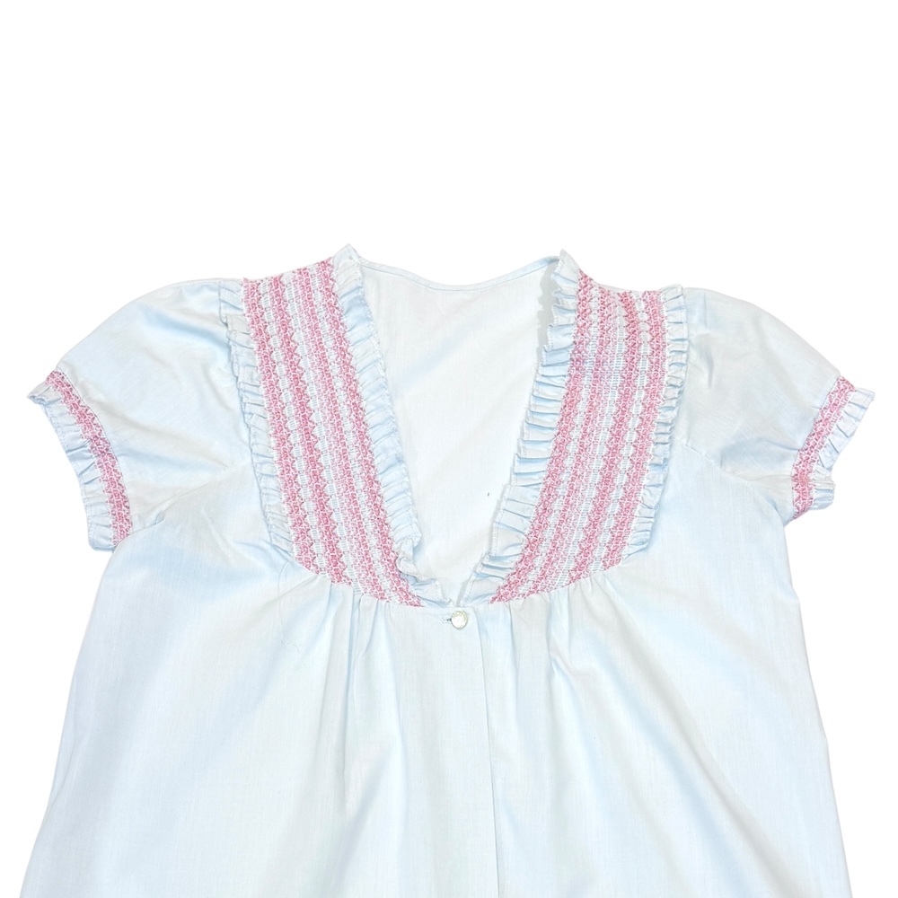 USEDのVintage フォーク刺繍 チュニックワンピース ベビーブルーです。淡いベビーブルーにピンクのスモッキング刺繍が映える、フリルヨークのヴィンテージチュニック。ふんわりとした袖とゆったりシルエットがメキシカンヴィンテージの空気感をまとい、どこか懐かしくて優しい印象に。ワイドパンツとの相性も抜群な一着です。