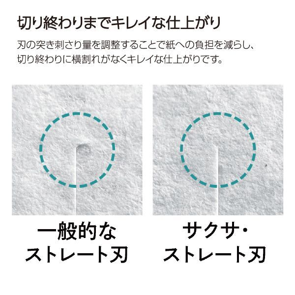 ●刃先がスリムなコクヨ独自設計刃で、狙いやすく、切り終わりまでキレイな仕上がり。従来のカーブ刃に比べて刃先が細く、切りたい場所が見えやすい。刃の突き刺さり量を調整することで紙への負担を減らしキレイな仕上がりを実現しました。