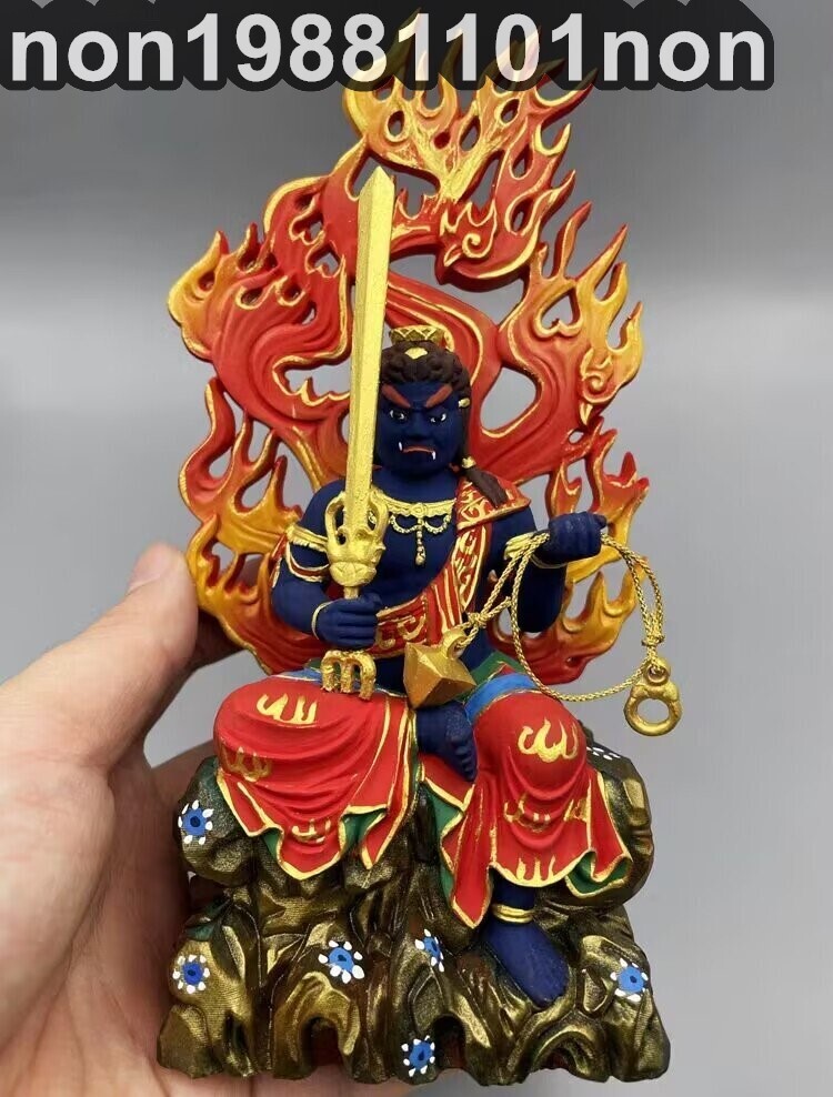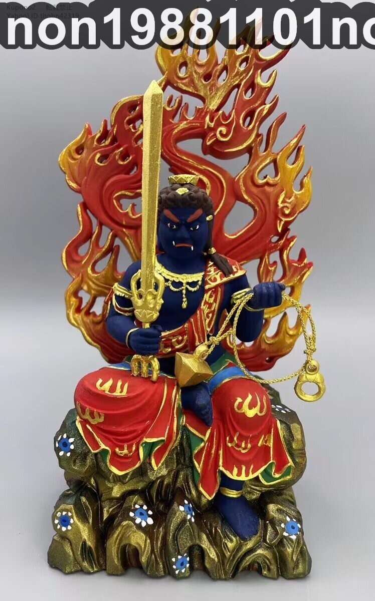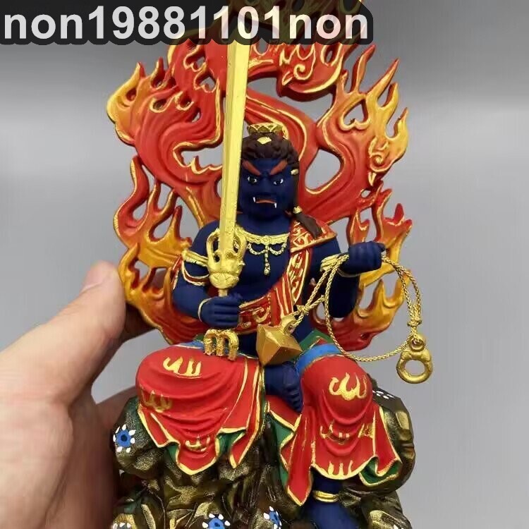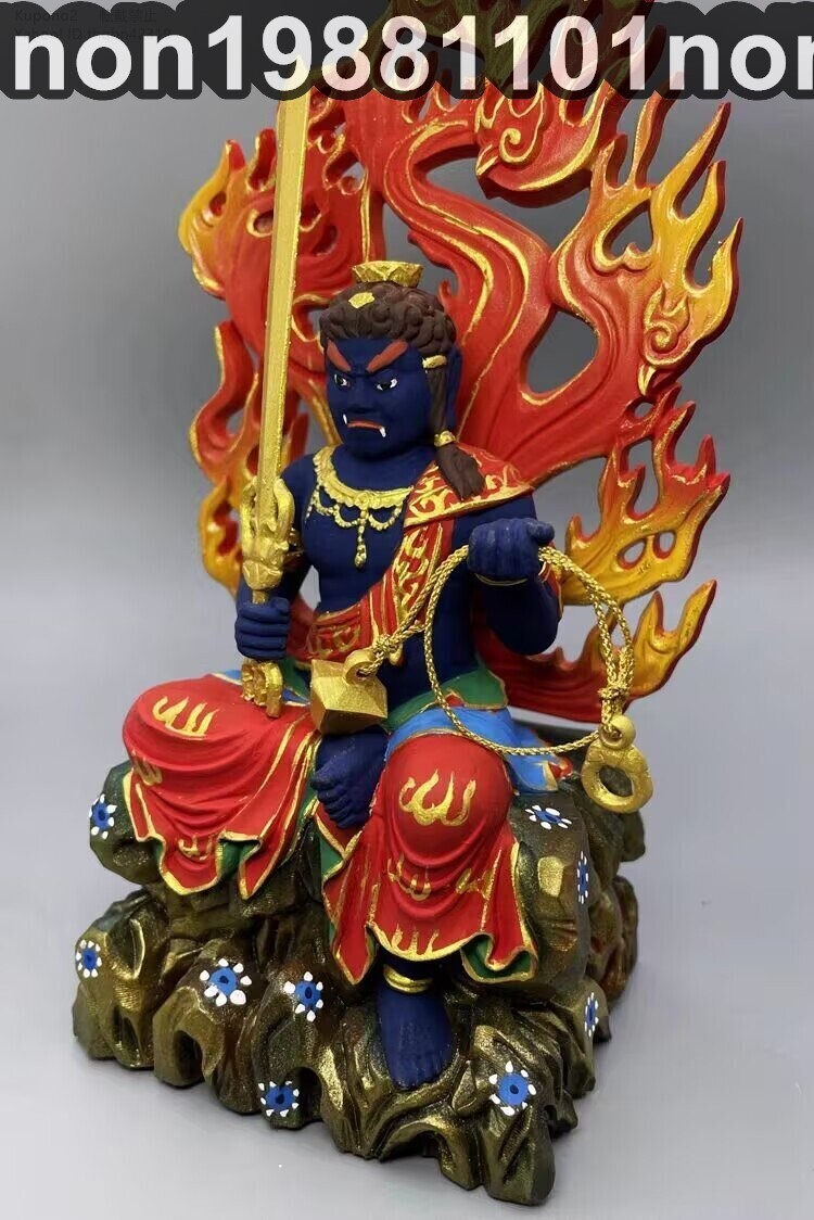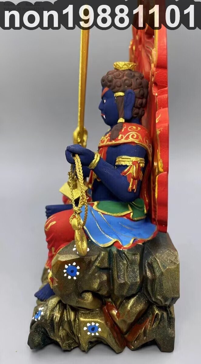 人気美品★仏像 不動明王座像 極彩色絵系 木彫り 仏像 不動尊 お守り本尊 総高18.5CM