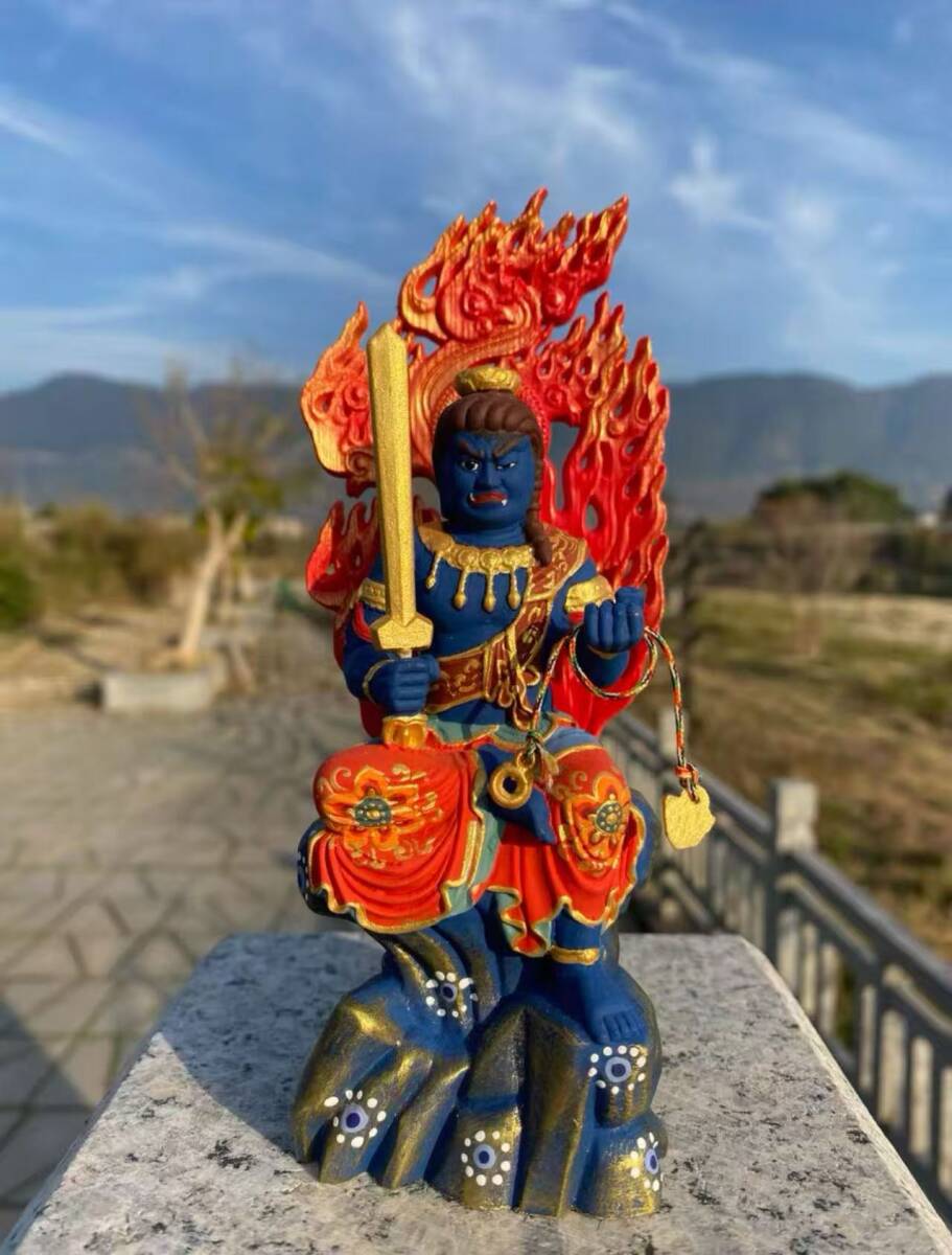 ●商品未使用 カラー:画像参照 ◆材質:木。 ◆サイズ:18.5CM。 ◆不動明王は、大日如来の化身ともいわれ、五大明王の中心に位置します。手には倶利伽羅剣(利剣、カドゥガ、三鈷剣、金剛剣、降魔剣など)と羂索(縄の先に金剛杵がついたもの)を持ちます。 ◆不動明王が、密教における最高神である大日如来の一の子分であり、明王の中心的存在だから、数ある明王の中で最も人気があります。家内安全、商売繁盛、交通安全などが祈願され、盛んな信仰を集めています。 ◆動かざる尊者という意味で、如来が教化しにくい衆生を救うために、見るからに恐ろしい形相をした姿で現れる。全ての災難苦難を除き、事故や災いから身を守ってくれる仏様と言 ●海外輸入品です。