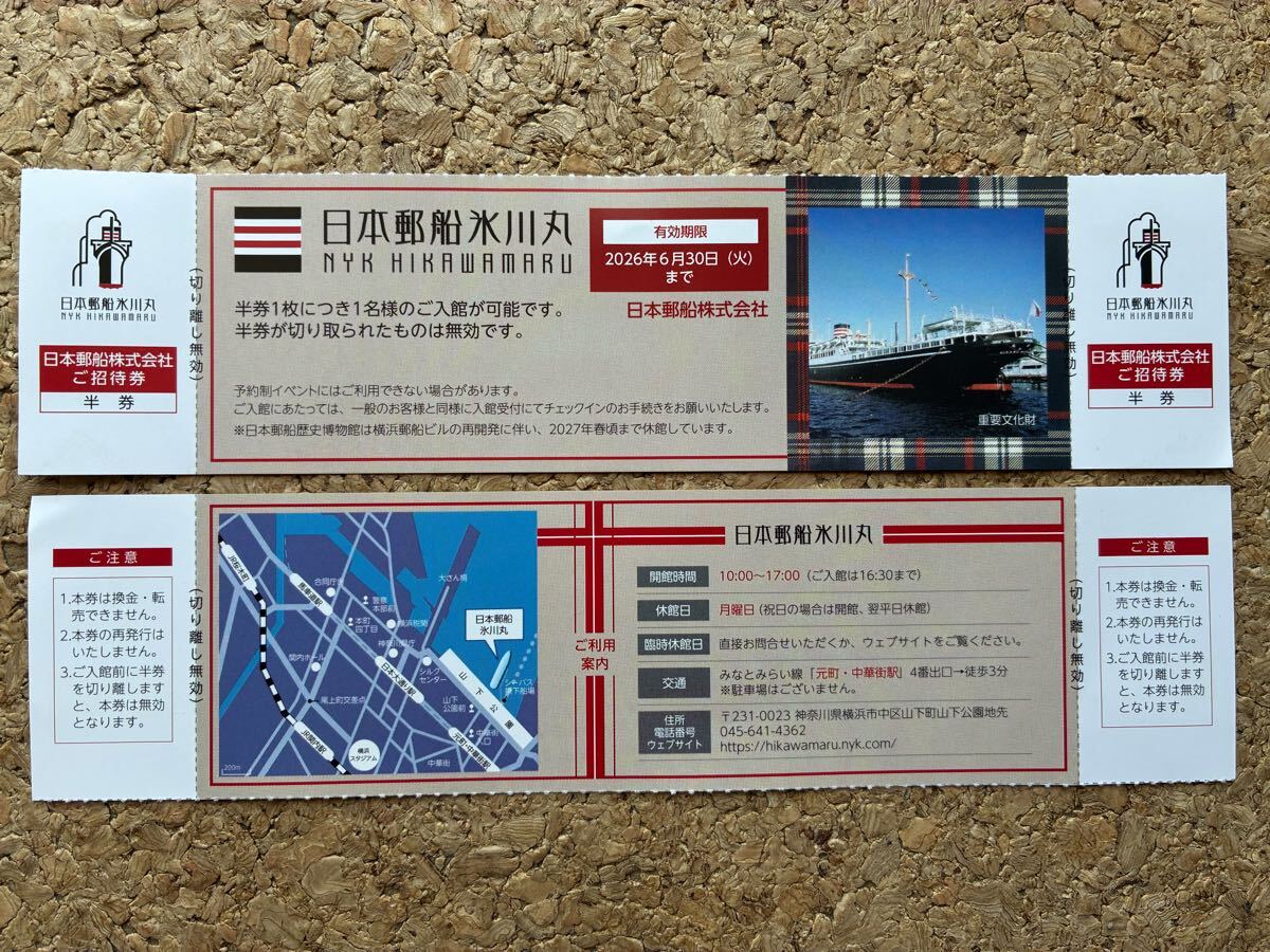 ●日本郵船株式会社 ご招待券 1枚 日本郵船氷川丸 ・1枚で2名まで入場可能です。 参考:入館料(1名) 一般 300円 有効期限 : 2026年6月30日まで ●ホ-ムペ-ジ https://hikawamaru.nyk.com/user_guide.html 参照 |
