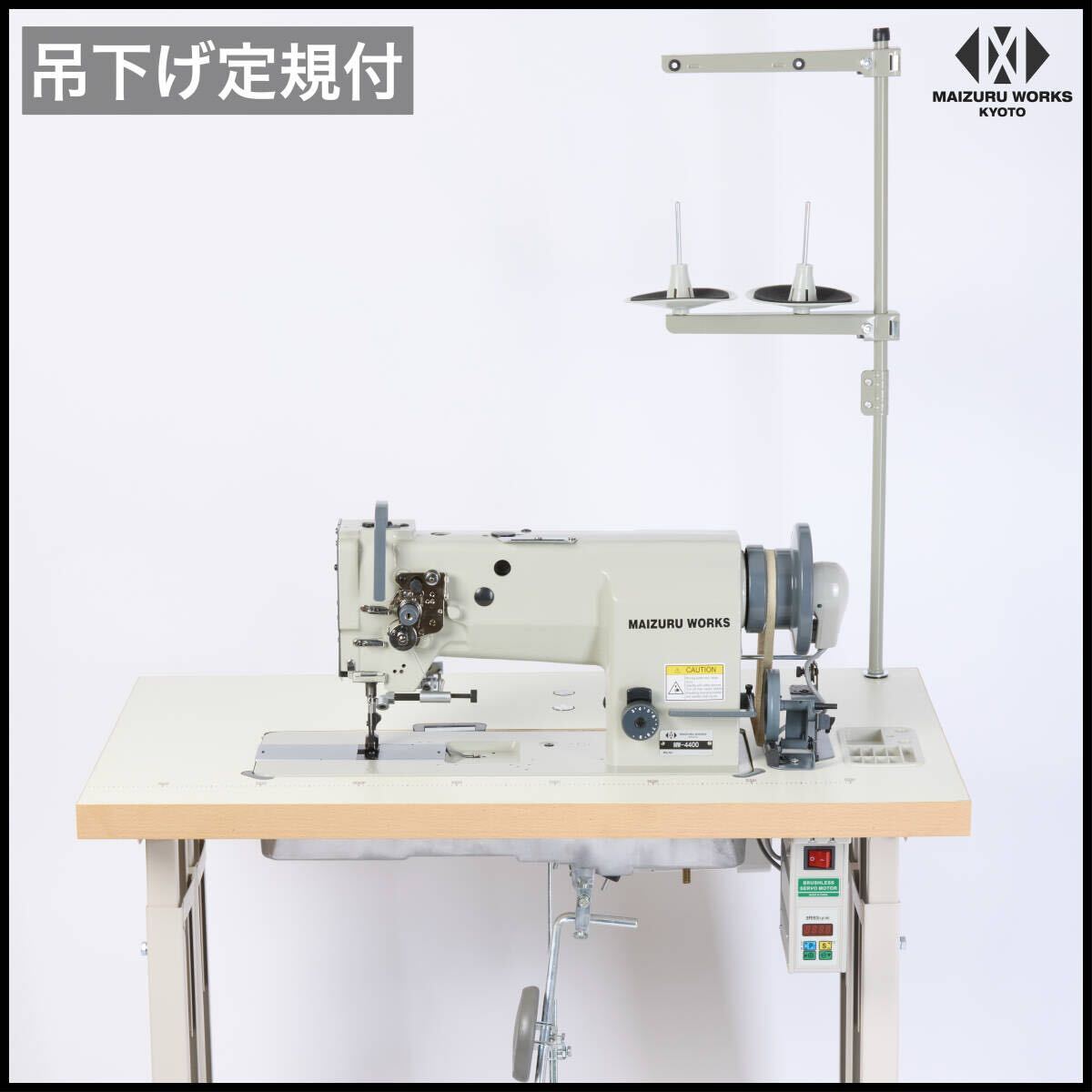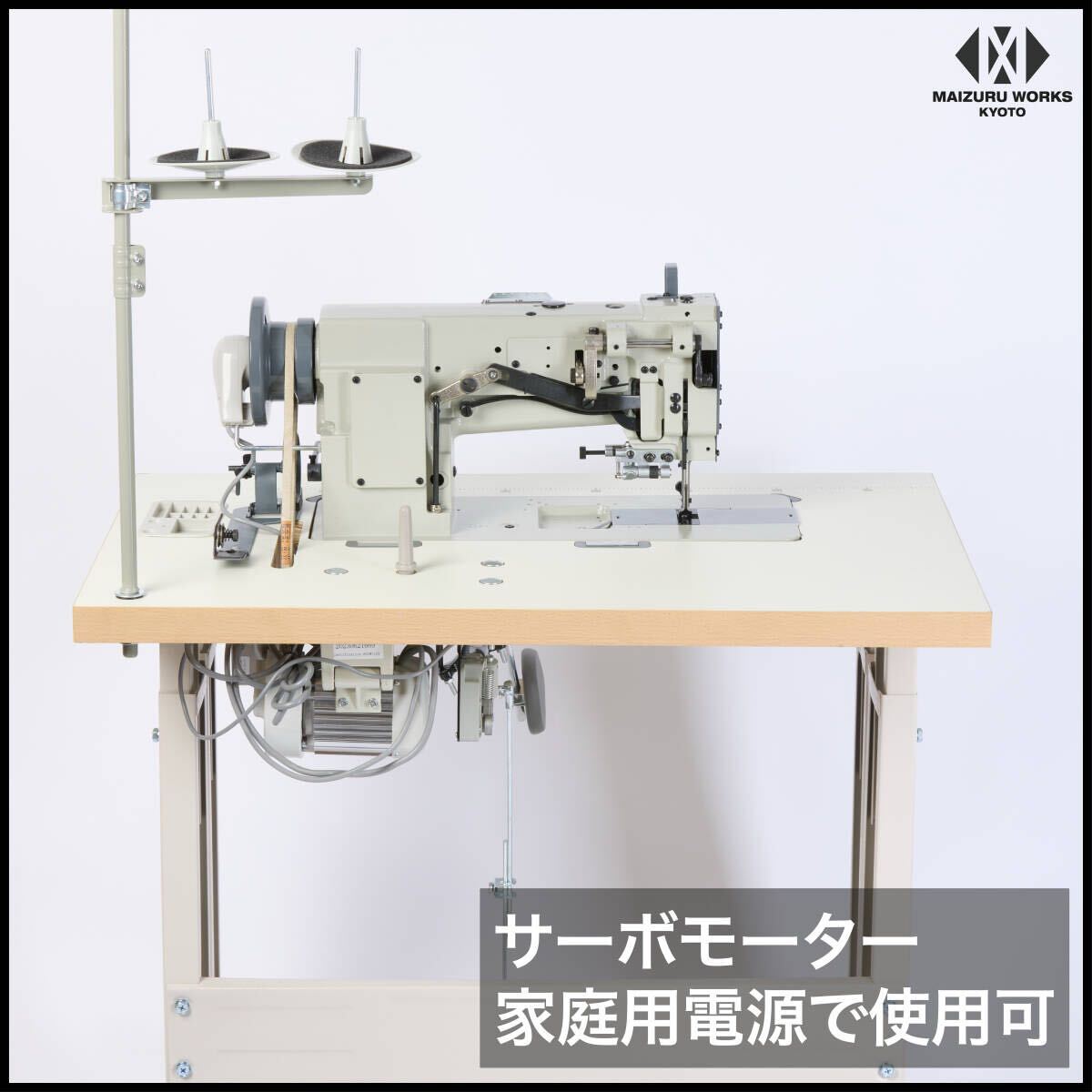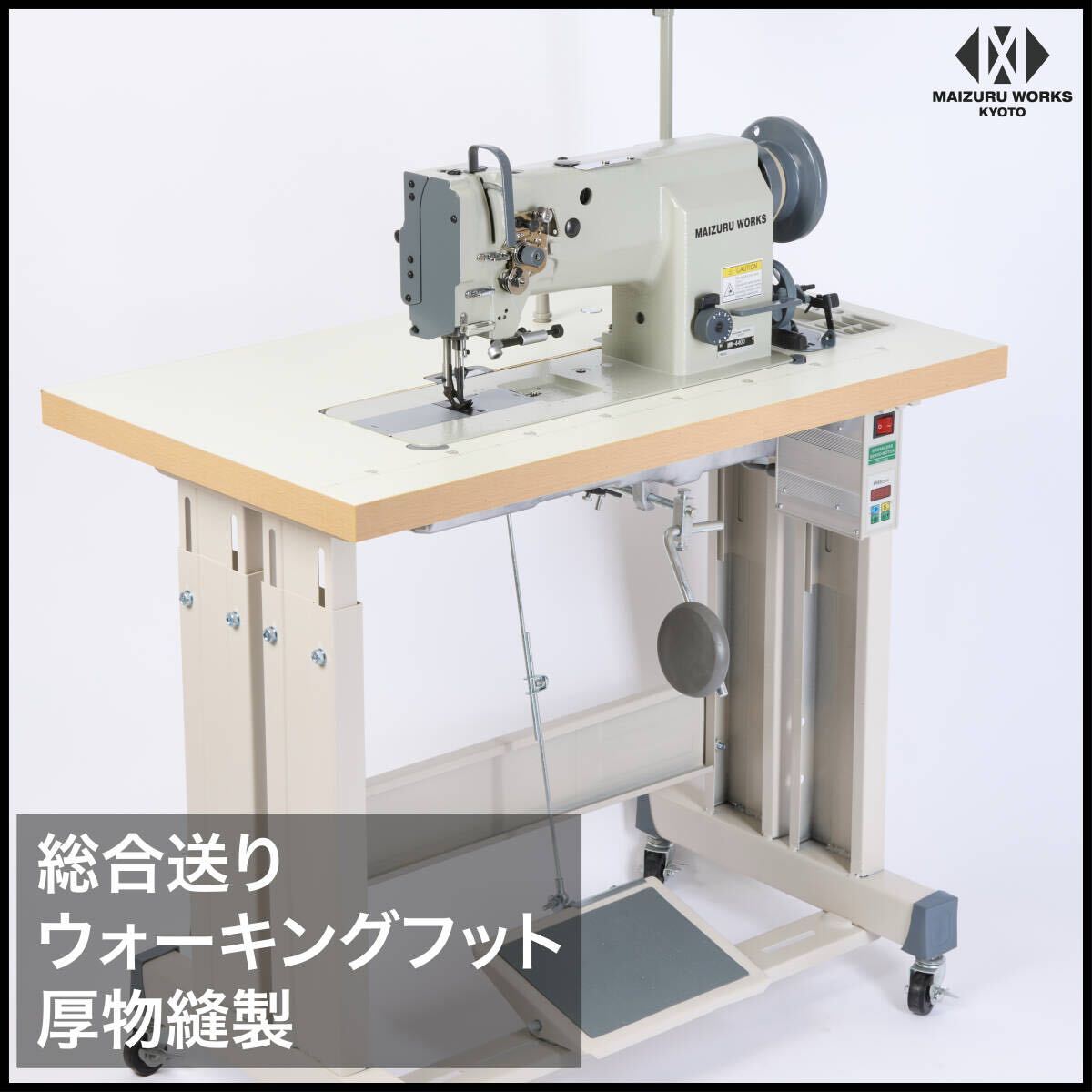 | 商品説明 | 【商品紹介】 ワークスペースが平面のため、直線や平面的な素材の縫製に適しています。形状が家庭用ミシンや職業用ミシンに近いので工業用ミシンの中では比較的扱いやすいミシンです。 カーシート、カバン、ソファ、ベルト、ブックカバー、財布、またキャンバスやアウトドア用品などの厚物縫製に使用されています。 総合送り、ウォーキングフット仕様で厚物の素材もしっかりとらえ縫製できます。腕ミシンと併用してご利用になる方が多いミシンです。腕ミシンも多数取り扱っております。 【特長】 ・総合送り、ウォーキングフット仕様 ・倍釜でボビンの交換頻度が少なくてすみます。 ・返し縫い機能付き。 ・メンテナンスの簡単な自動給油方式。 ・縫い目長さの調節ダイヤル付き。 ・吊り下げ定規付属(設置済み) ・テーブルはインテリアに映えるホワイトの木目調天板 ・キャスター付きで移動が簡単にできます。 ・検出器付きで、ペダルを踏むと針位置は下りた状態で停止、縫あがり時は奥へ踏み込むと上部で停止します。 ・新型サーボモーターは、45mmのプーリーを使用しており、縫製作業を慎重かつゆっくり行う場合にも対応しています。 ・同時に、高速な縫製作業にも対応し、パネルでワンタッチでスピードを簡単に調整できます。 【仕様】