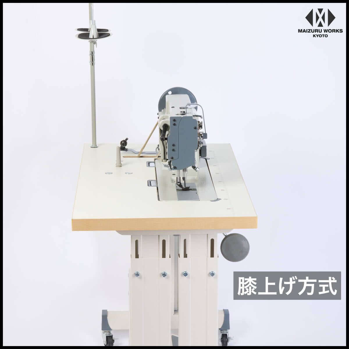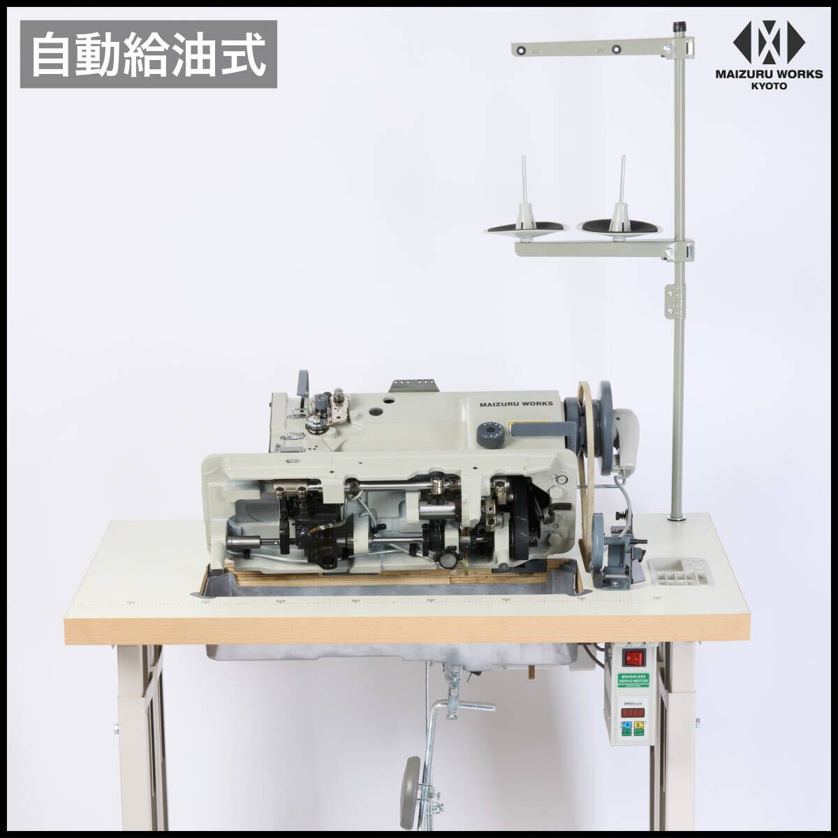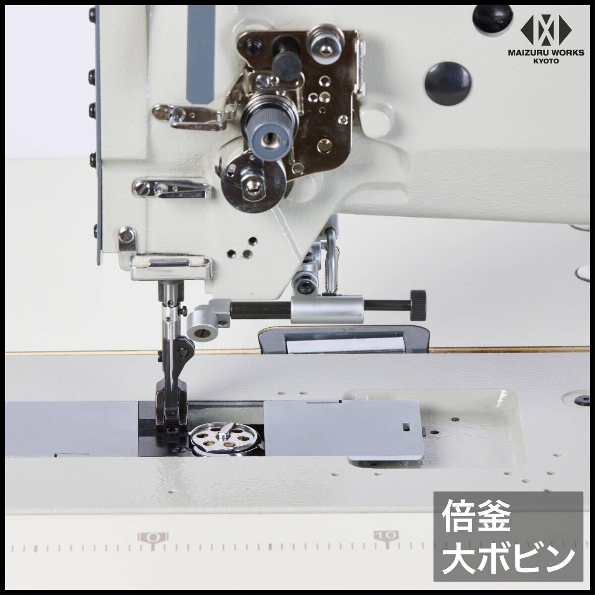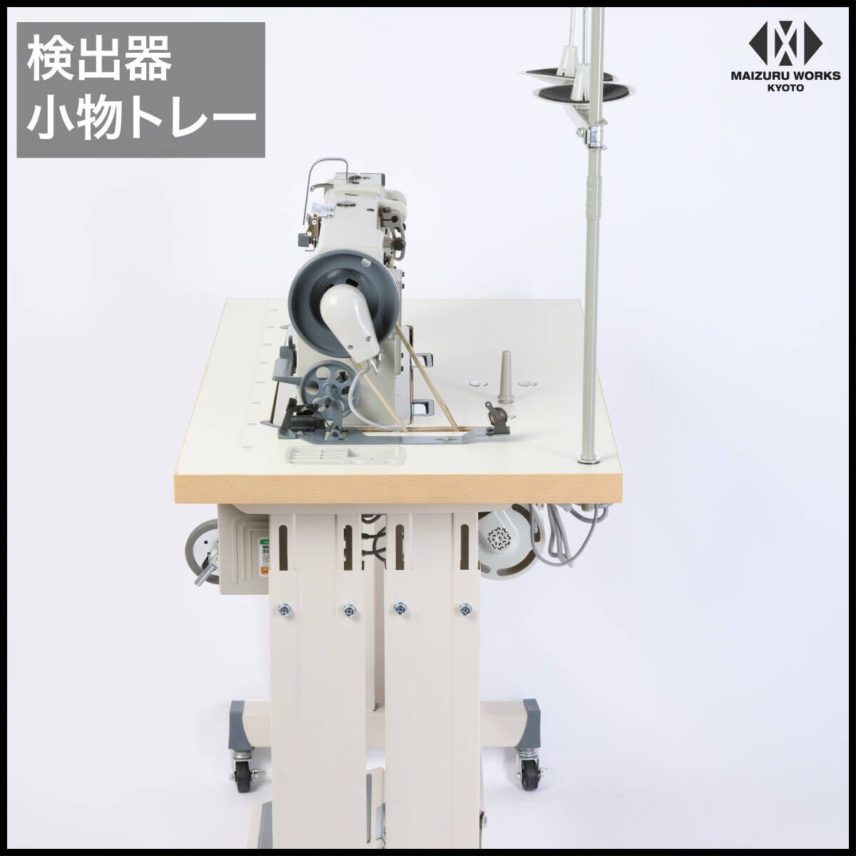 | 商品説明 | 【商品紹介】 ワークスペースが平面のため、直線や平面的な素材の縫製に適しています。形状が家庭用ミシンや職業用ミシンに近いので工業用ミシンの中では比較的扱いやすいミシンです。 カーシート、カバン、ソファ、ベルト、ブックカバー、財布、またキャンバスやアウトドア用品などの厚物縫製に使用されています。 総合送り、ウォーキングフット仕様で厚物の素材もしっかりとらえ縫製できます。腕ミシンと併用してご利用になる方が多いミシンです。腕ミシンも多数取り扱っております。 【特長】 ・総合送り、ウォーキングフット仕様 ・倍釜でボビンの交換頻度が少なくてすみます。 ・返し縫い機能付き。 ・メンテナンスの簡単な自動給油方式。 ・縫い目長さの調節ダイヤル付き。 ・吊り下げ定規付属(設置済み) ・テーブルはインテリアに映えるホワイトの木目調天板 ・キャスター付きで移動が簡単にできます。 ・検出器付きで、ペダルを踏むと針位置は下りた状態で停止、縫あがり時は奥へ踏み込むと上部で停止します。 ・新型サーボモーターは、45mmのプーリーを使用しており、縫製作業を慎重かつゆっくり行う場合にも対応しています。 ・同時に、高速な縫製作業にも対応し、パネルでワンタッチでスピードを簡単に調整できます。 【仕様】