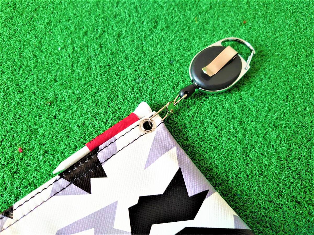 ワイヤーリールによって最長74cmまで伸びるカラビナが付いており、キャディバッグ、ラウンドバッグ、スタンドクラブケースなどにつけてラウンドし、手元に引き寄せてさっと利用していただく事が可能です。