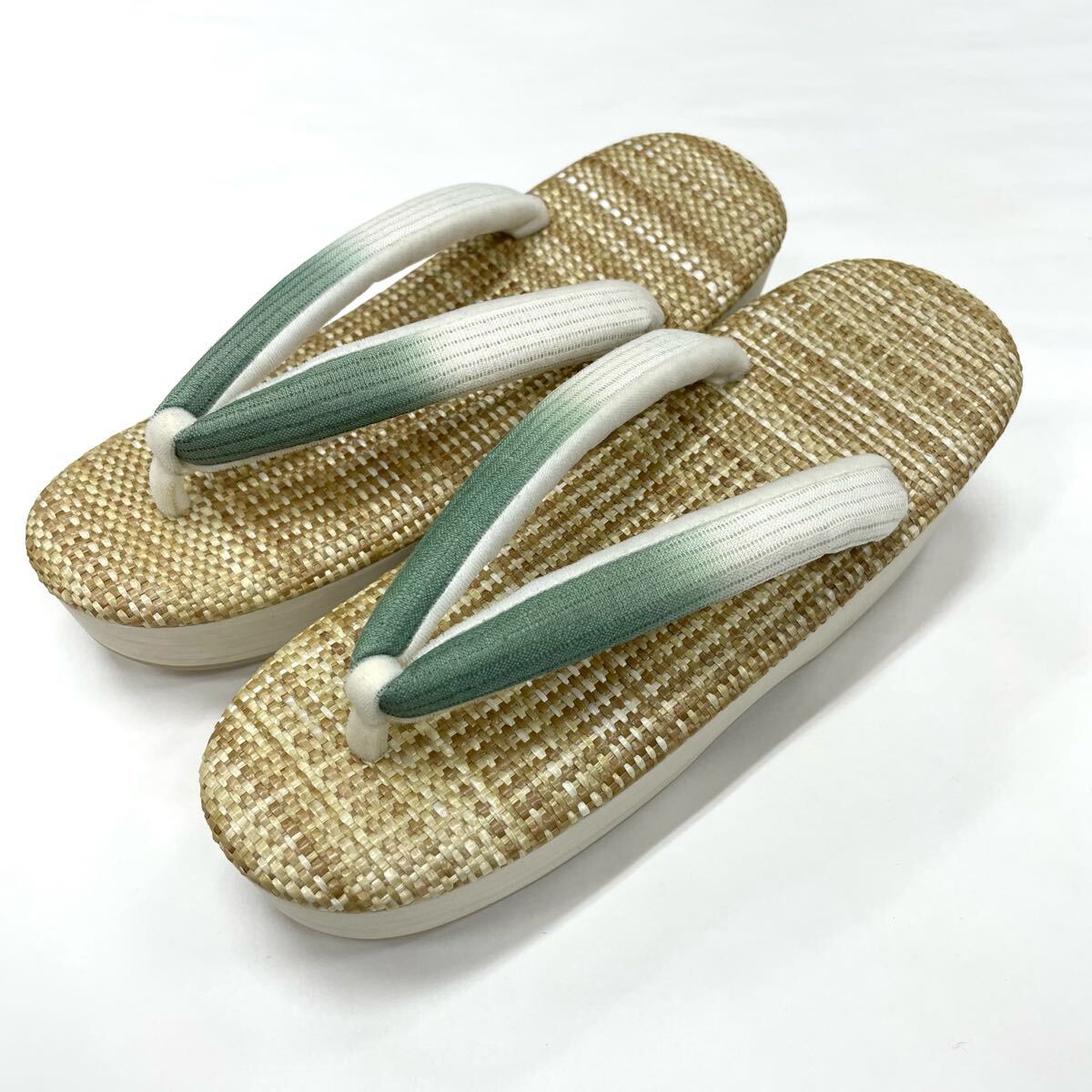 またこちらは鼻緒に高級感のある「渋いグリーンボカシの正絹の絽の鼻緒」を使用しており、草履台の天部分も「ナイロン混の夏素材」を使用しておりますので夏の暑い時期でも「履き跡」や「汚れ」などを気にすることなく、固く絞った水拭きで簡単にお手入れができるワンランクアップの夏草履となっております。
