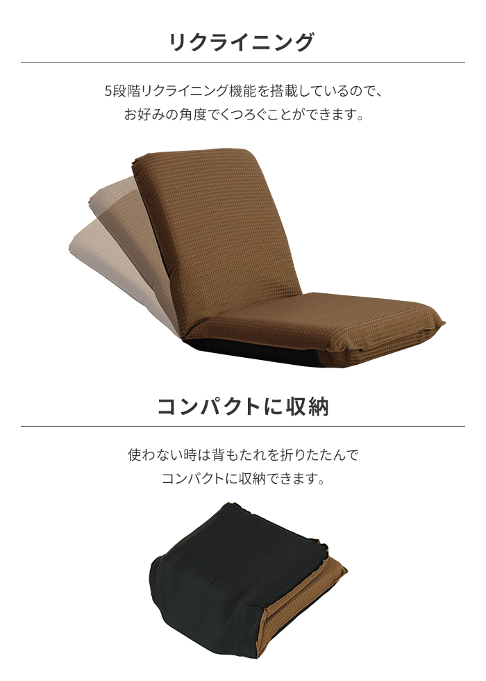 | シンプルなデザインでスタンダードな座椅子です。 ローデスクでの作業時や読書、TVなどどこにでも持ち運んで使える座椅子です。 使わない時は背もたれを折りたたんでコンパクトに収納できます。 |
