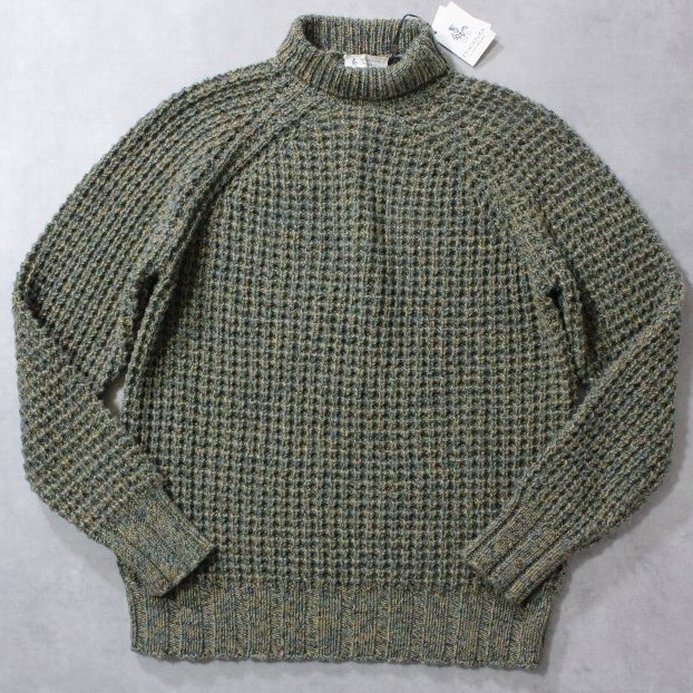 ローゲージでワッフル状の網目のような編み模様で、ゆったりとしたリラックスフィット。