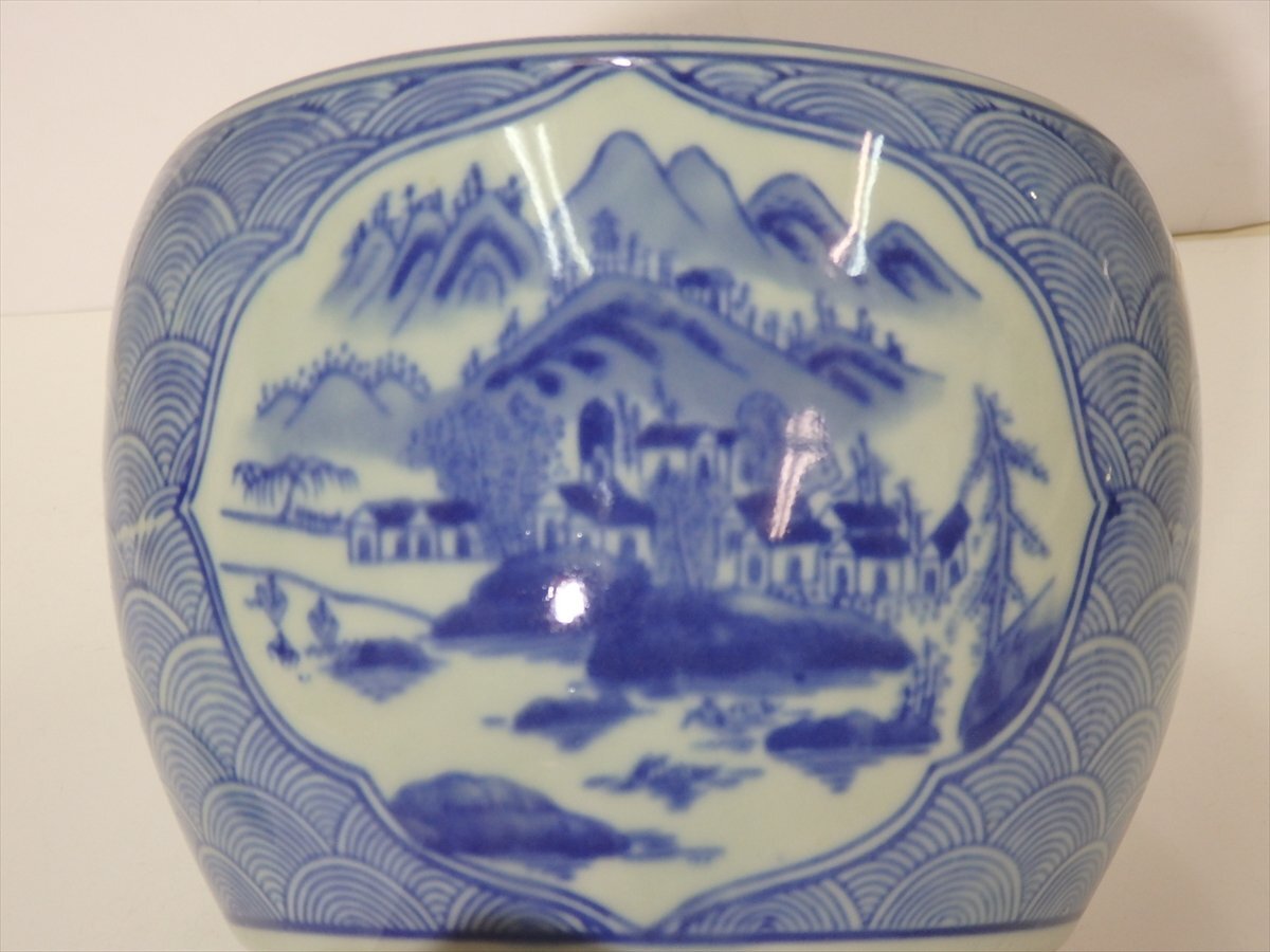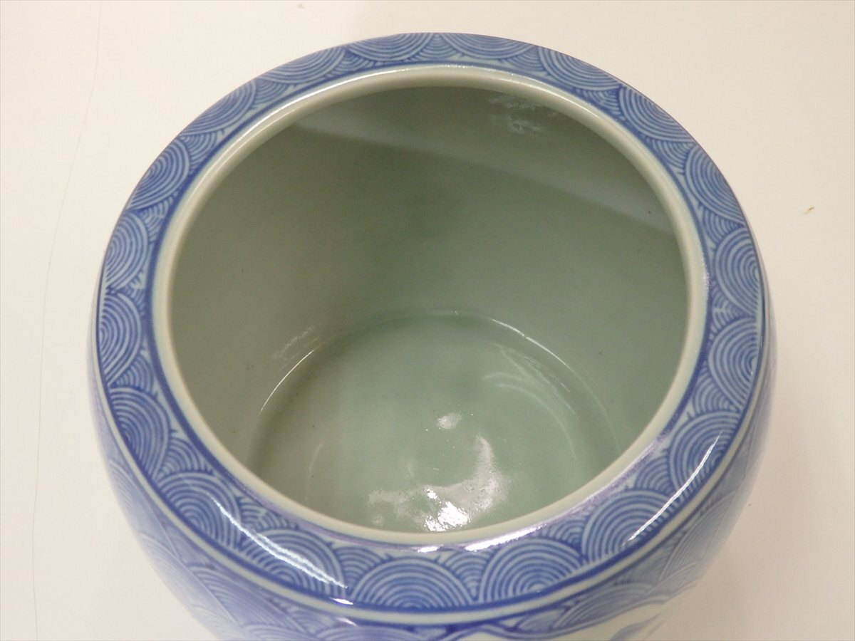 ★染付山水【小さめ手あぶり】状態良好! 青海波 底に銘 直径20.5cm 高さ14.8cm 口径14.4cm 火鉢 手炉 手焙り 民芸家具 茶道具