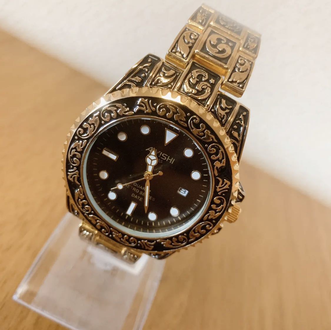 メンズアンティーク腕時計 総柄 ゴールド クォーツ