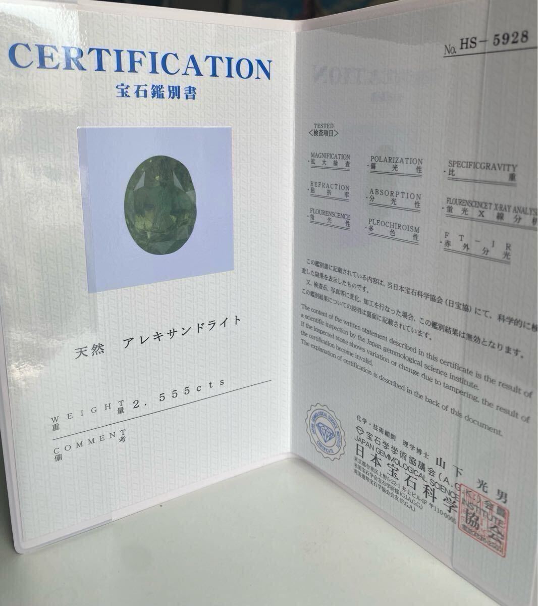 種類: 天然アレキサンドライト 2.555ct 鑑別書付き