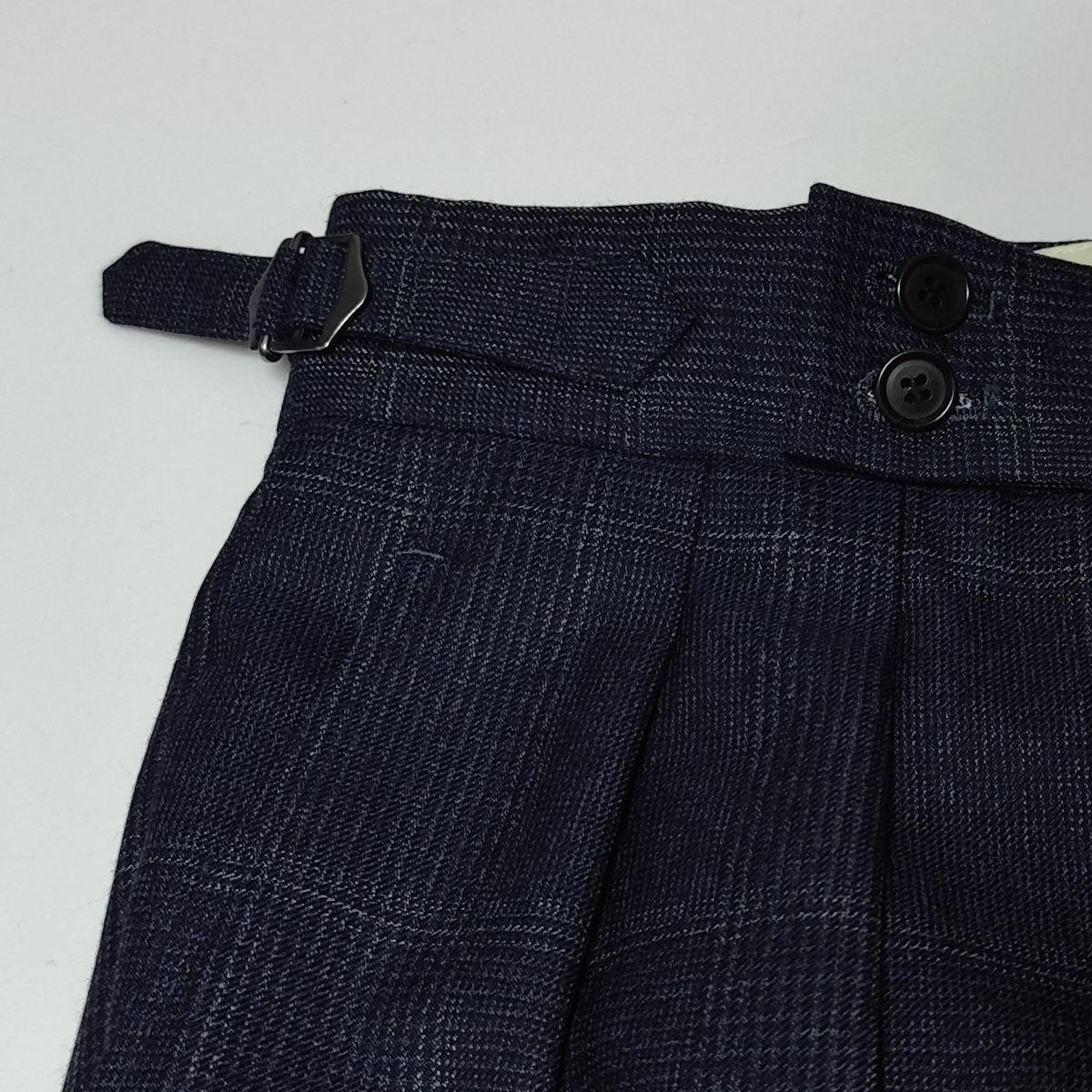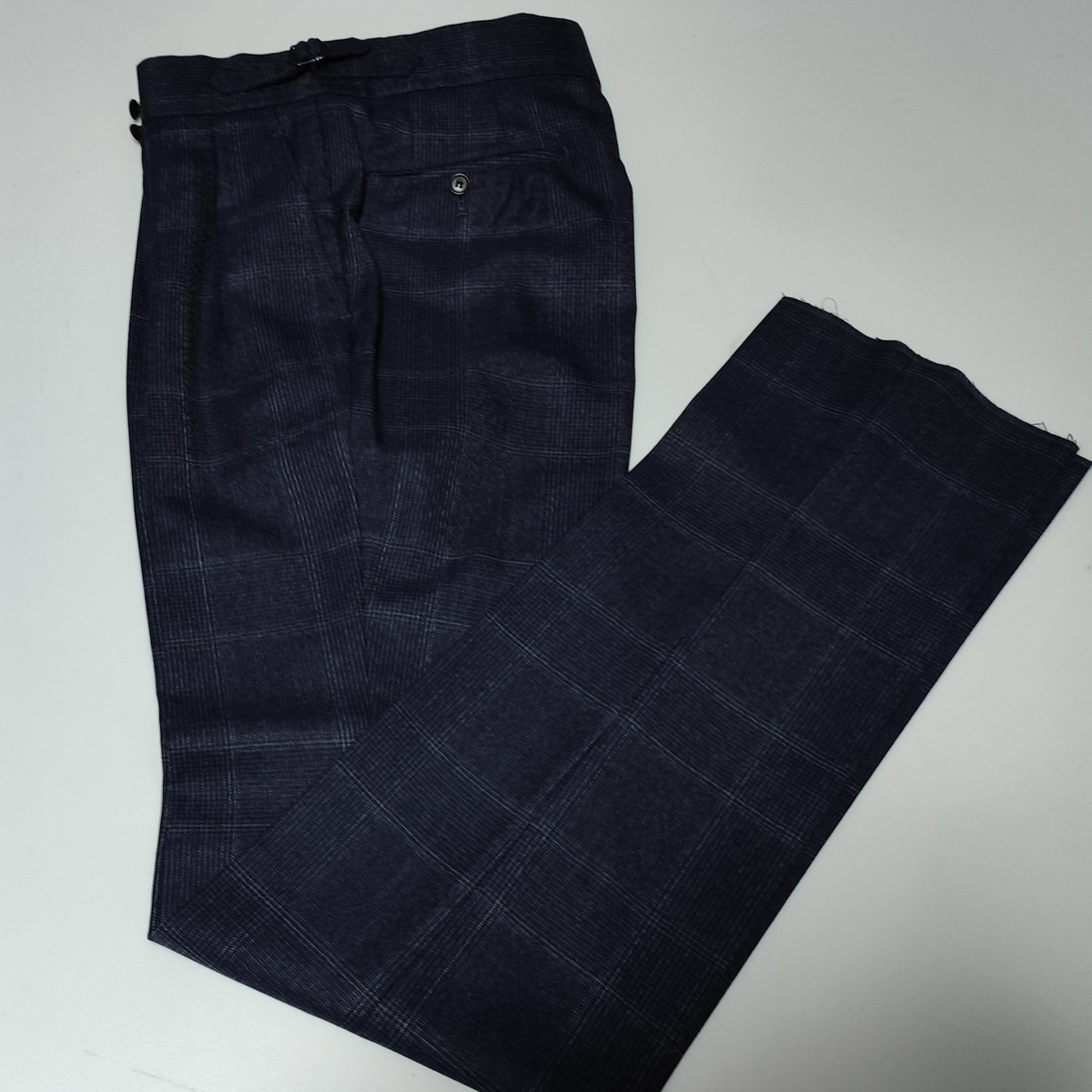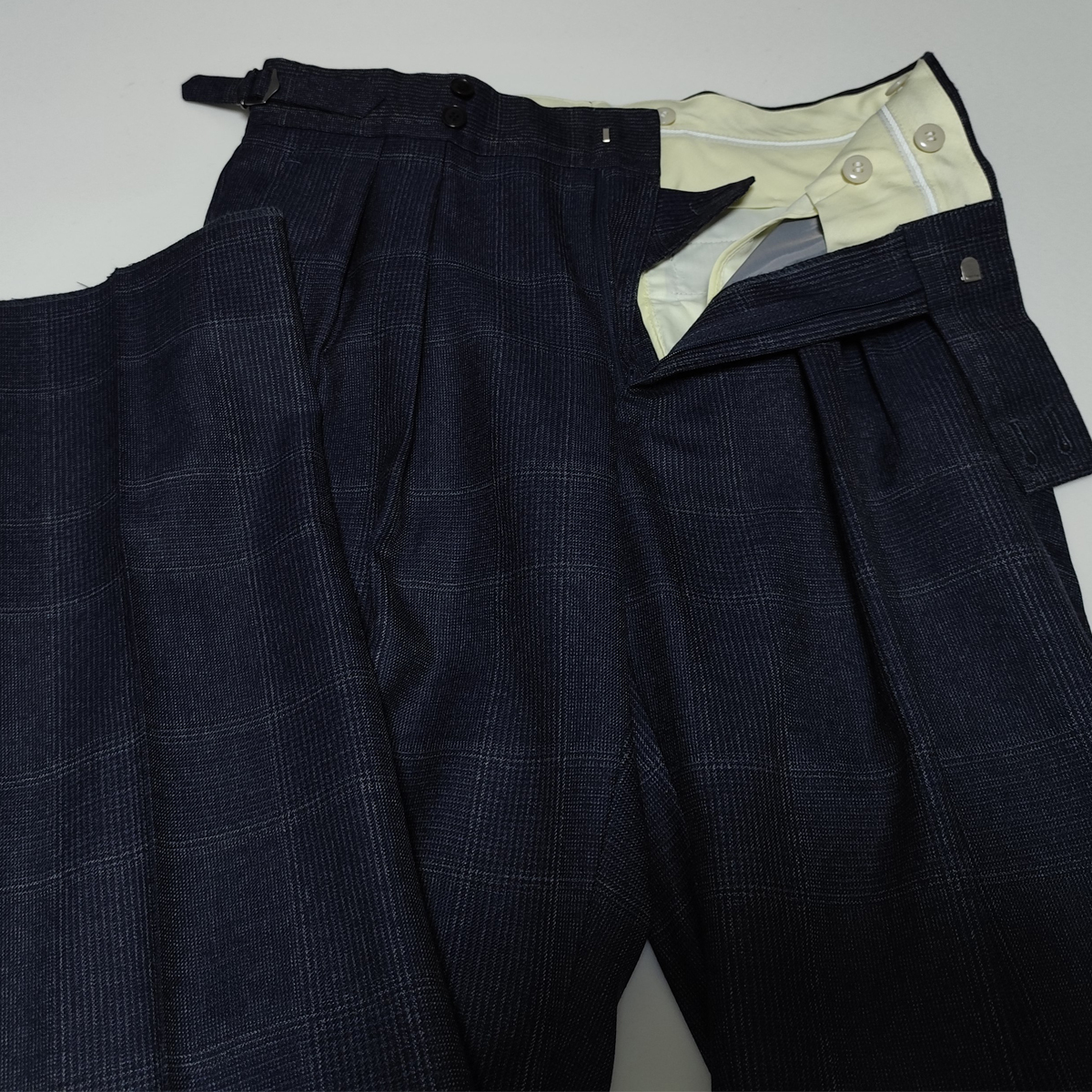 <実寸> ジャケット 肩幅42.5 身幅48.5 袖丈60.5 着丈72 パンツ ウエスト78 股上27 股下94 わたり33 裾幅19.5 ツータック、裾上げ未加工 | ||||