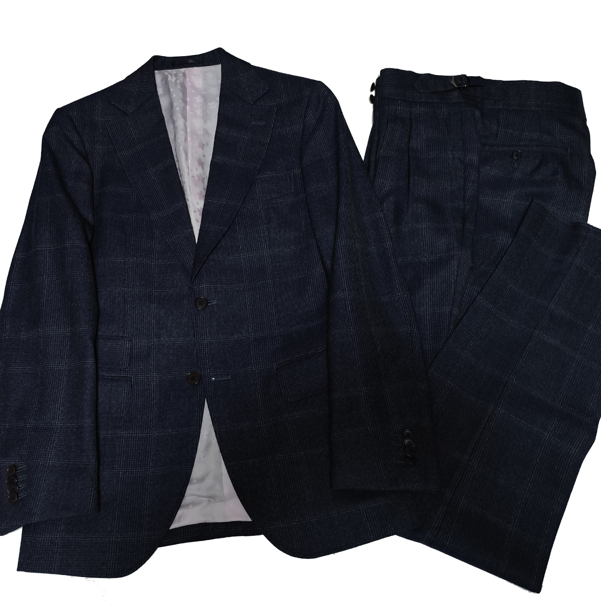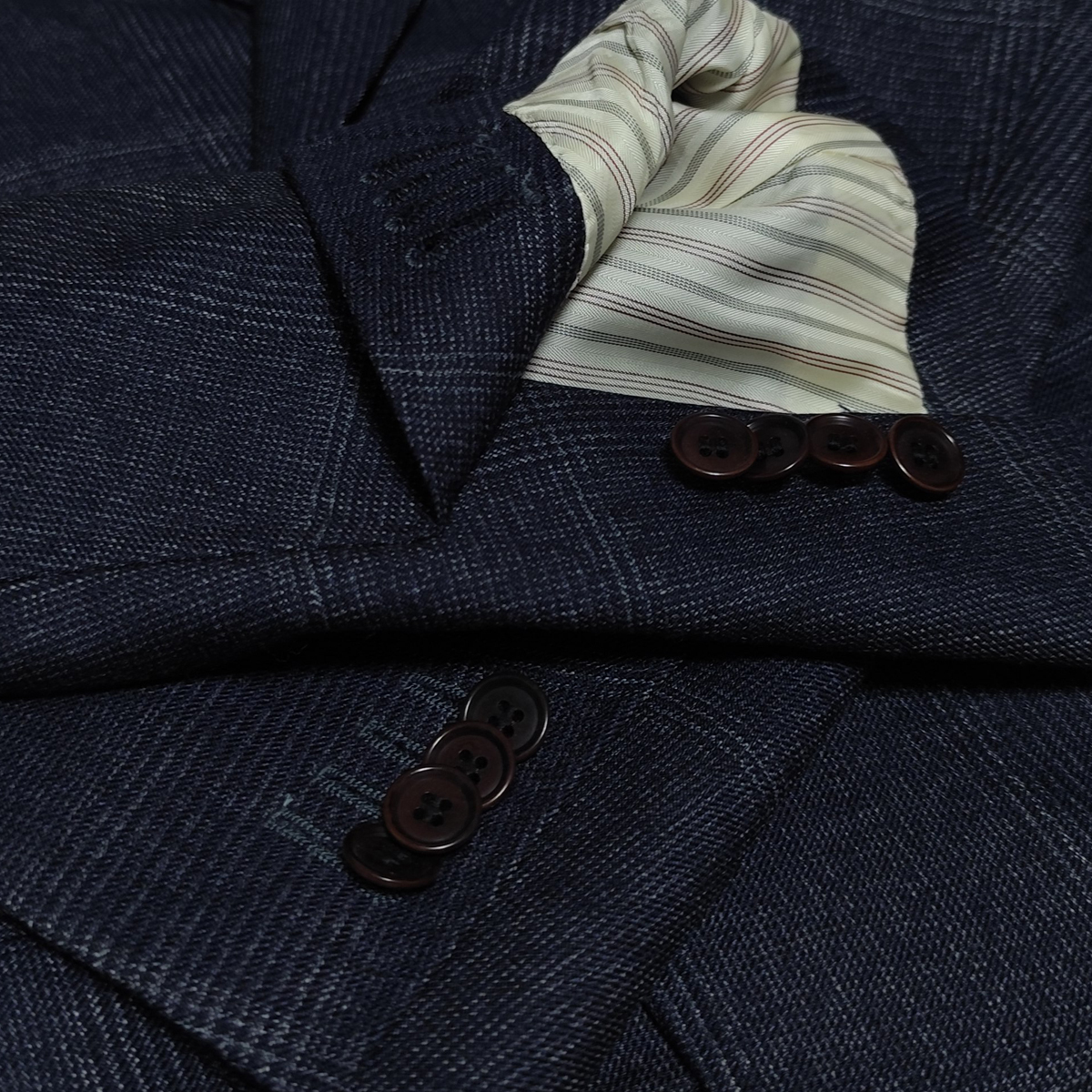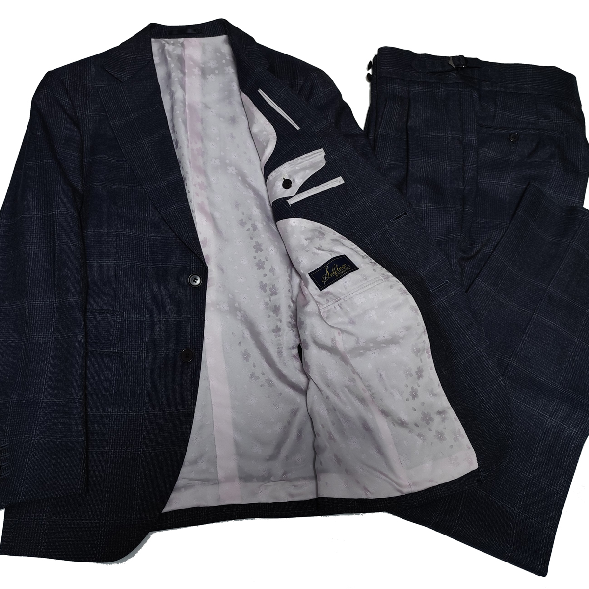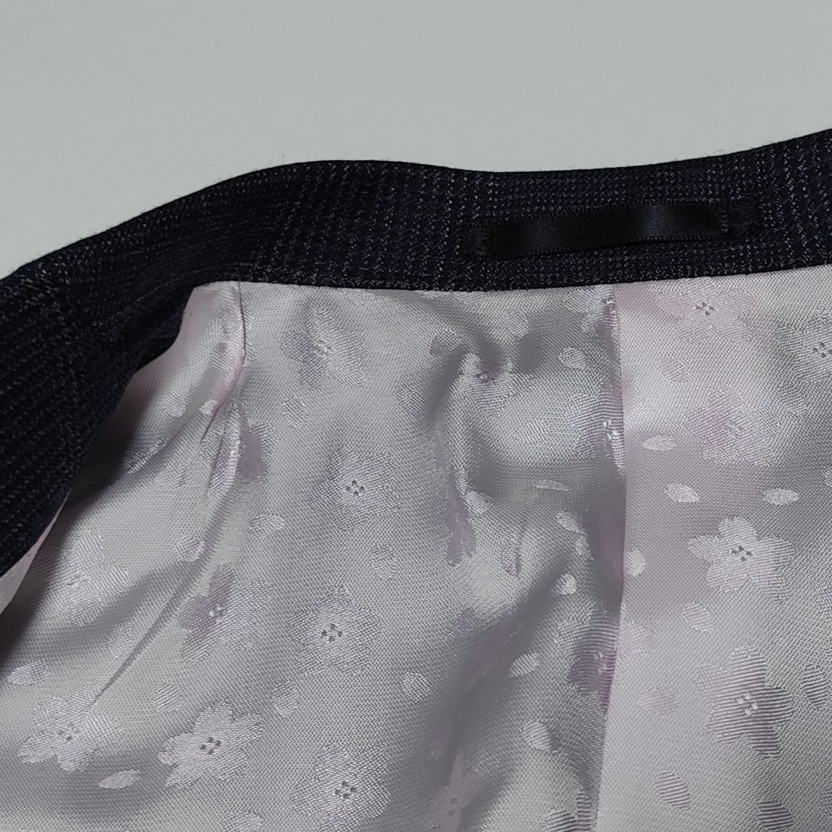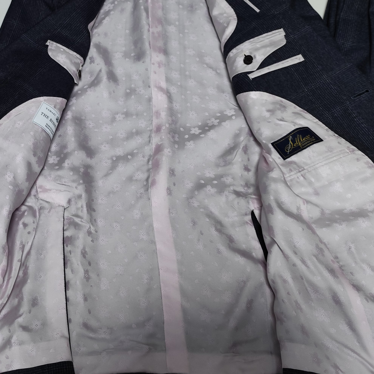 ジャケットには、フロントボタン二個。カフスボタン四個(本切羽)。 ポケットは外側に胸ポケットを含め三つ、チェンジポケット。内側右に一つ、左に四つ(うち一つは縦型)。 サイドベンツ。 裏地は総裏・台場仕立て。 パンツはベルトレス仕様。両サイドに調整ベルト付き。 サスペンダー用ボタン付き。 「セルフレックス」はオンワード樫山が展開する本格パーソナルオーダースーツライン。日本人の体型のデータを元にした型紙を使用し国内で縫製を行っています。 素材は尾州地区で100年以上の歴史がある「山栄毛織」の「THE BISHU PRIDE」を使用。 稀少なションヘル織機で織られた肉厚な高品質なウール地で、程よい光沢とメランジ感のある素材が特徴です。ハリ感もあり着心地が良い高級素材です。 チェンジポケット、本切羽、ベルトレスなどこだわりの仕様や、ダークなお色味のグレンチェック柄が、スタイリッシュでクラシカルな雰囲気を醸し出しています。 薄ピンク・桜柄の裏地も洒落ています。 ジャケットはウエストが程よくシェイプされたデザイン。 パンツはウエスト周りにゆとりを持たせたツータック仕様です。 生地も仕立ても上質で上品。 ビジネスにはもちろんパーティーシーンにもぴったりです。 サンプル品として出回ることはほとんどないので、サイズの合う方はマストバイです。 この機会に是非! | ||||